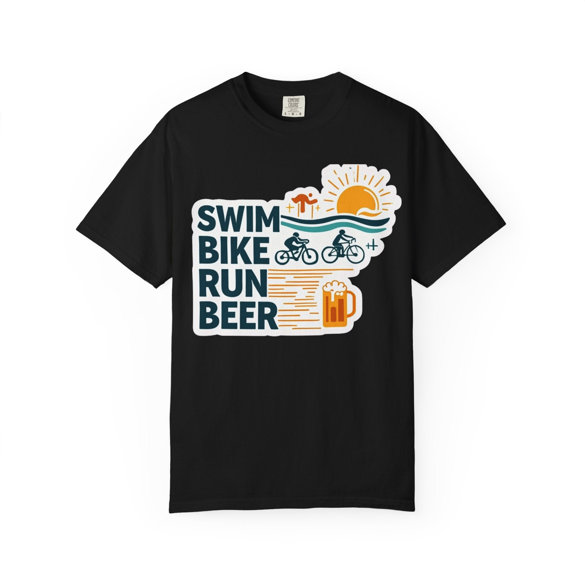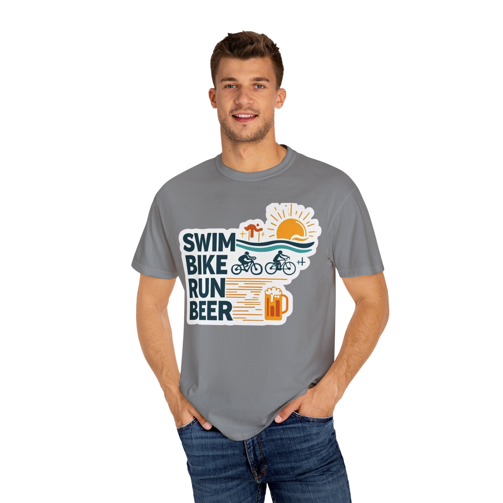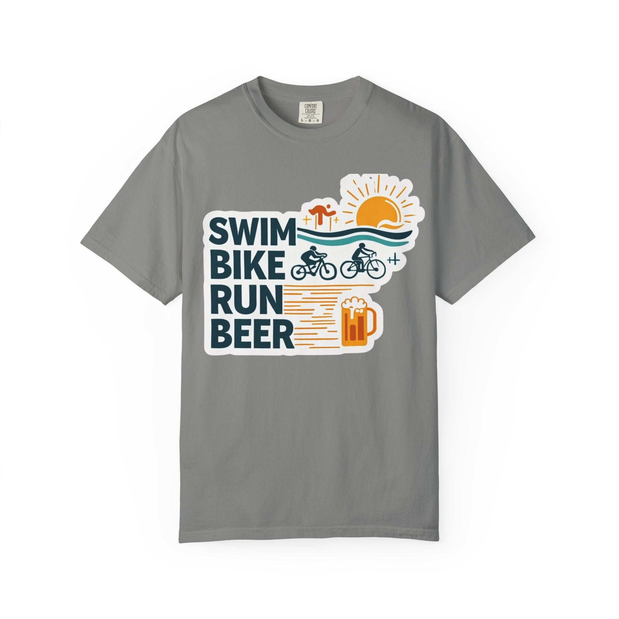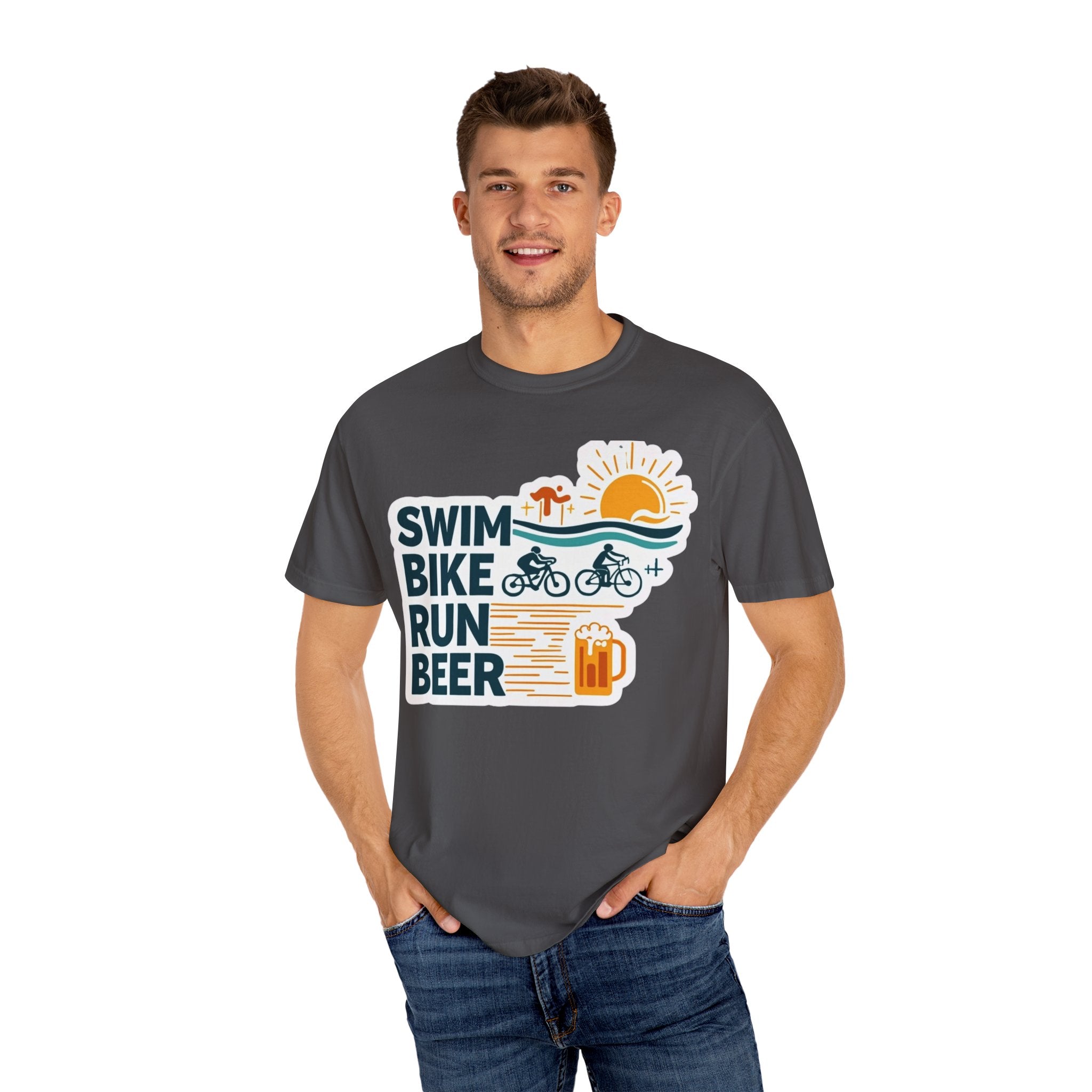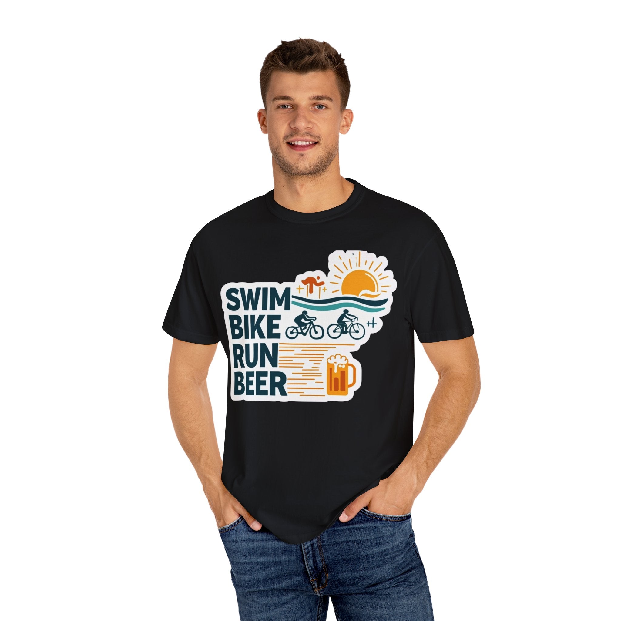 Unisex Triathlon Adventure T-Shirt Swim Bike Run Beer 100% Cotton Relaxed Fit Casual Summer Tee for Athletes