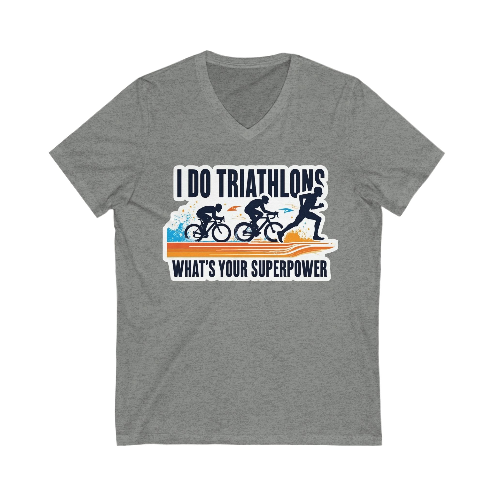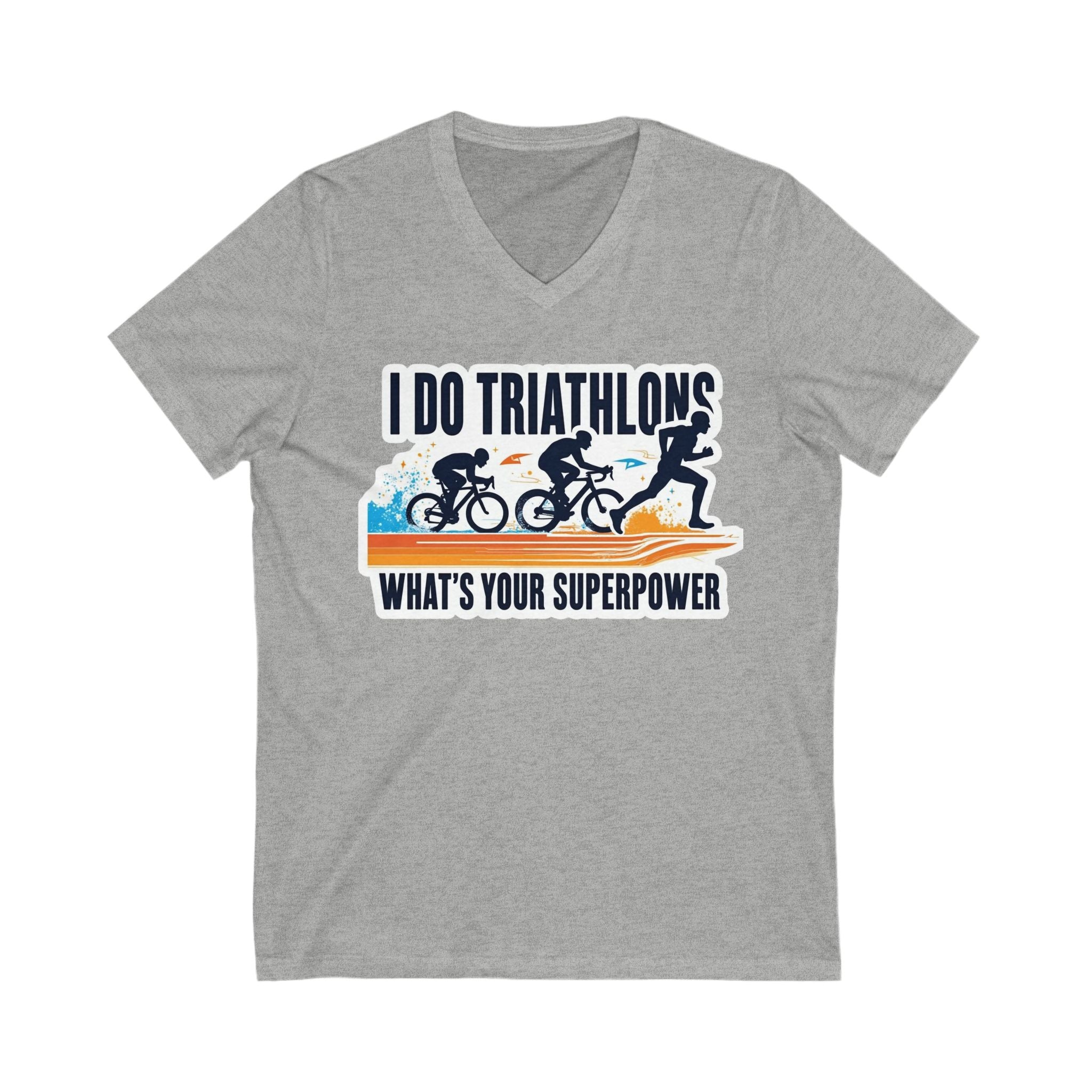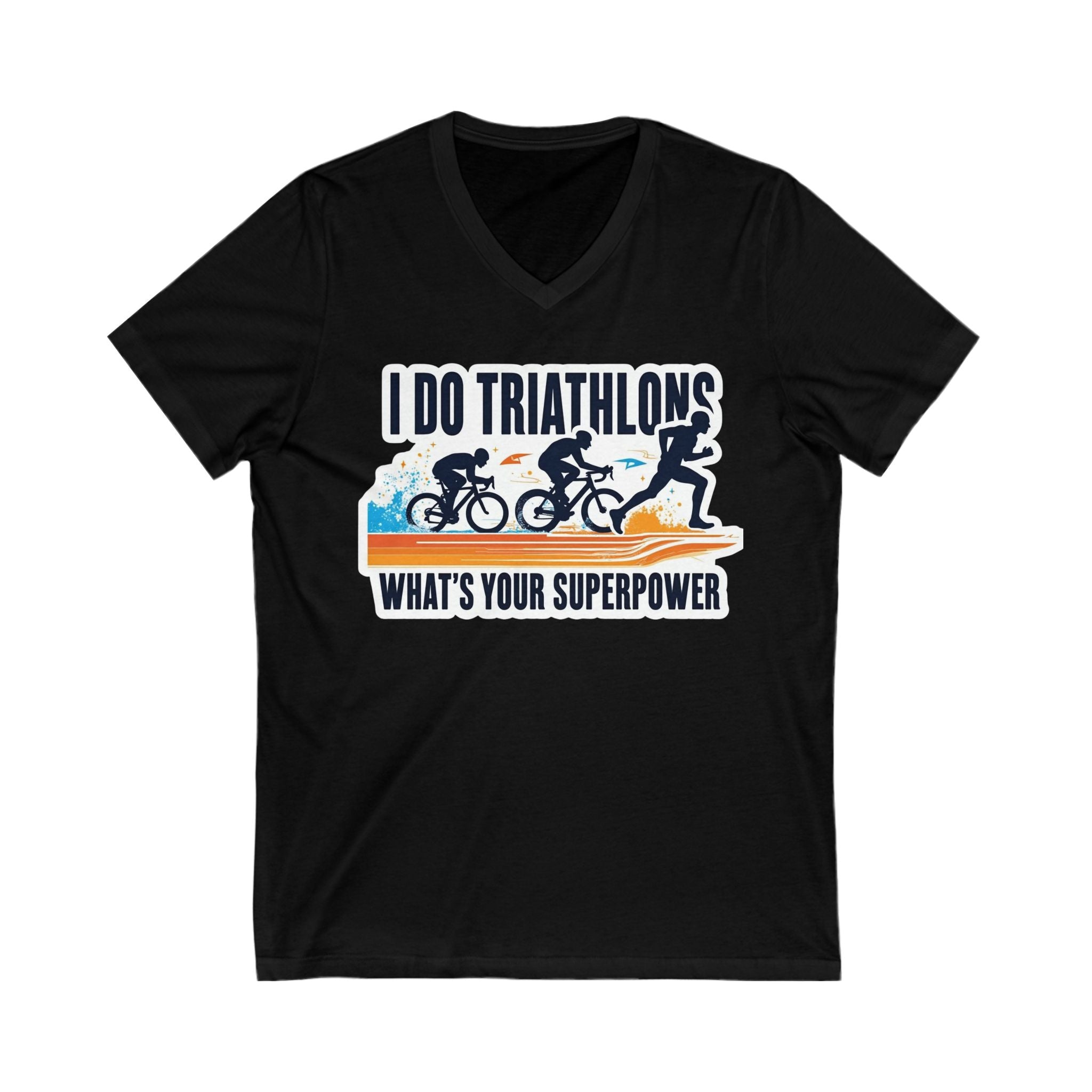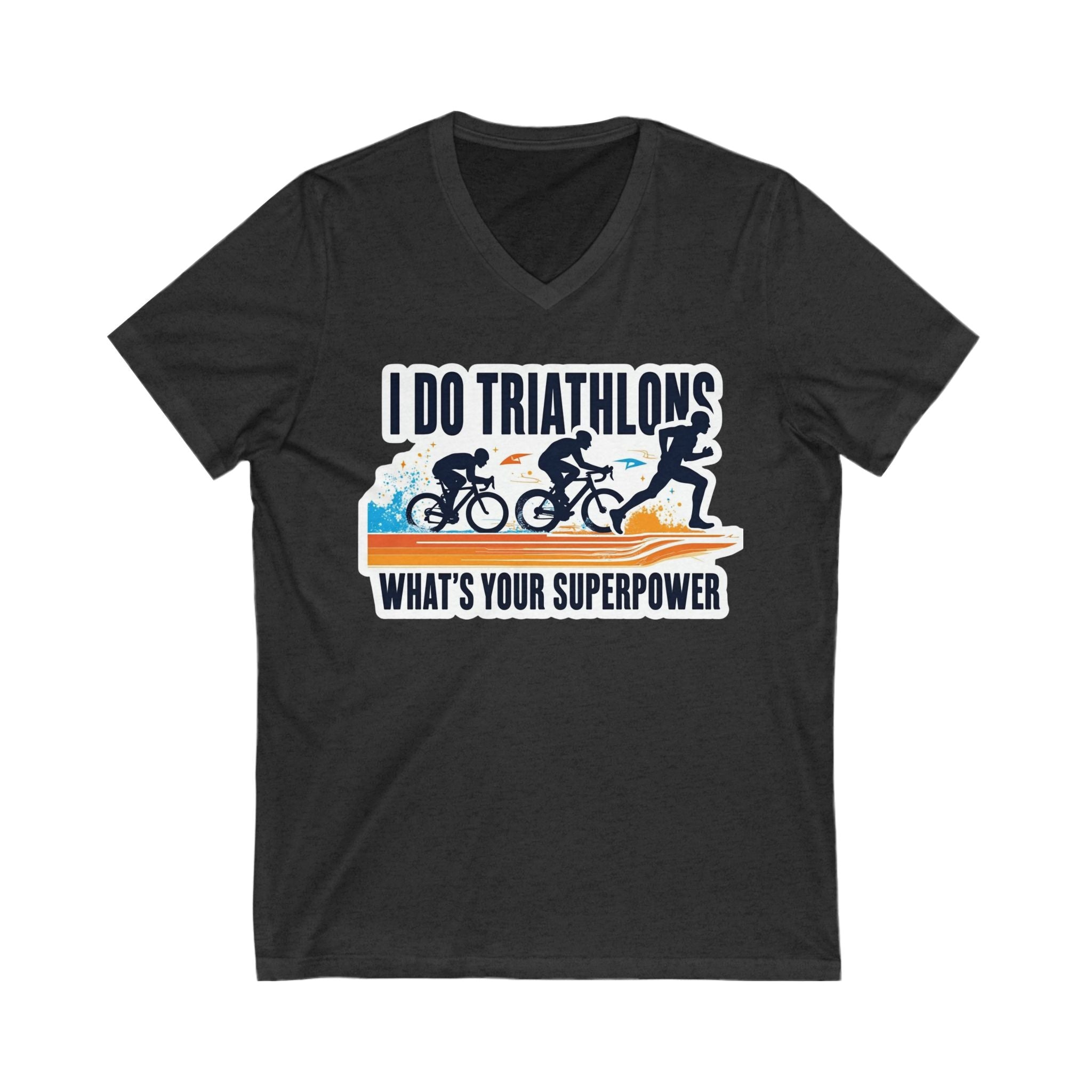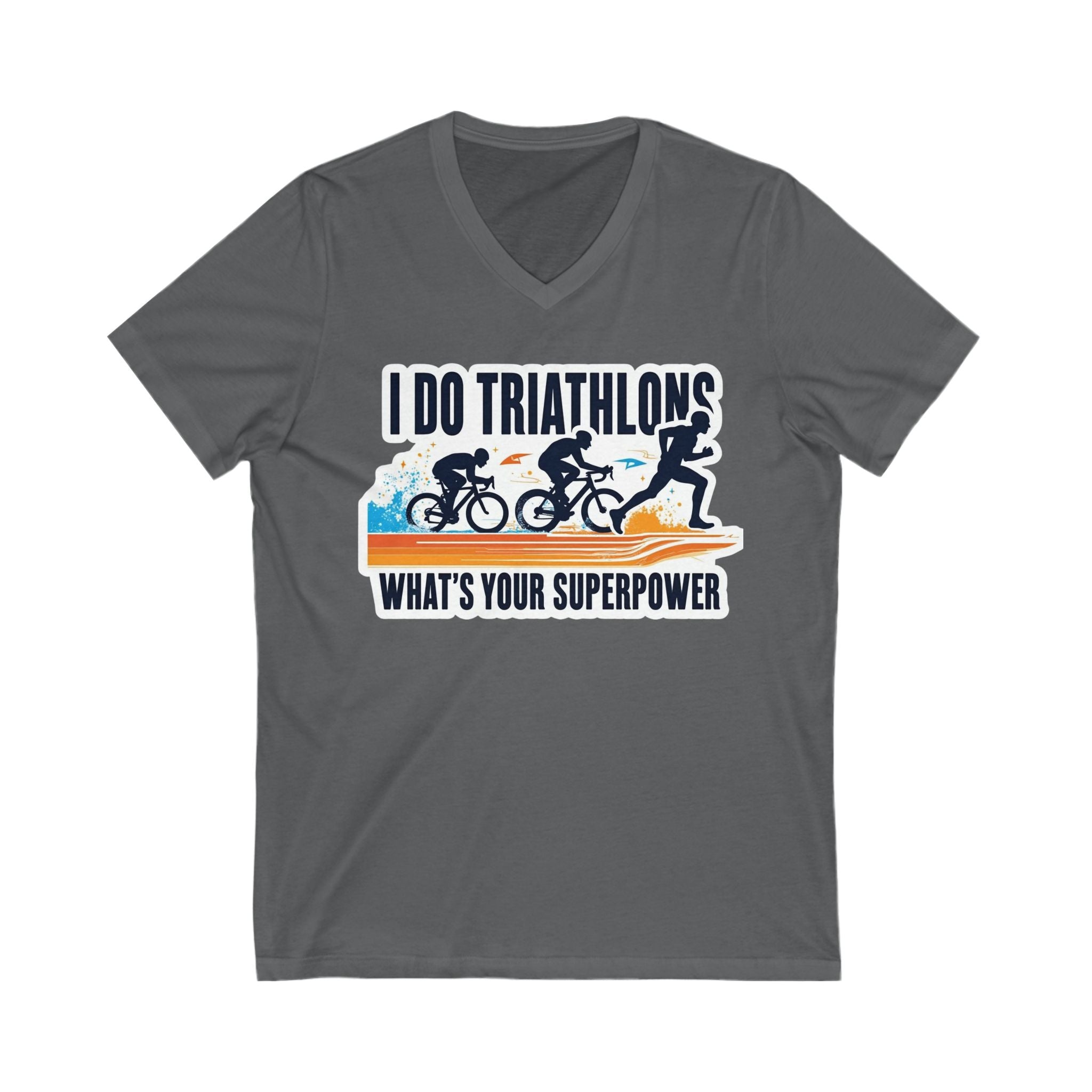 Introducing a stylish Unisex Jersey Short Sleeve V-Neck Tee that embodies the spirit of adventure and determination. Perfect for triathletes and fitness enthusiasts, this tee is designed to inspire and motivate. Its lightweight, breathable fabric makes it an ideal choice for both training and everyday wear, allowing you to showcase your passion for sports with comfort and style. The modern retail fit and trendy V-neckline provide a flattering silhouette, making it suitable for casual outings, gym sessions, or even as a fun conversation starter at events. This tee is a great gift for fitness lovers during holidays, anniversaries, or any personal achievement celebrations.