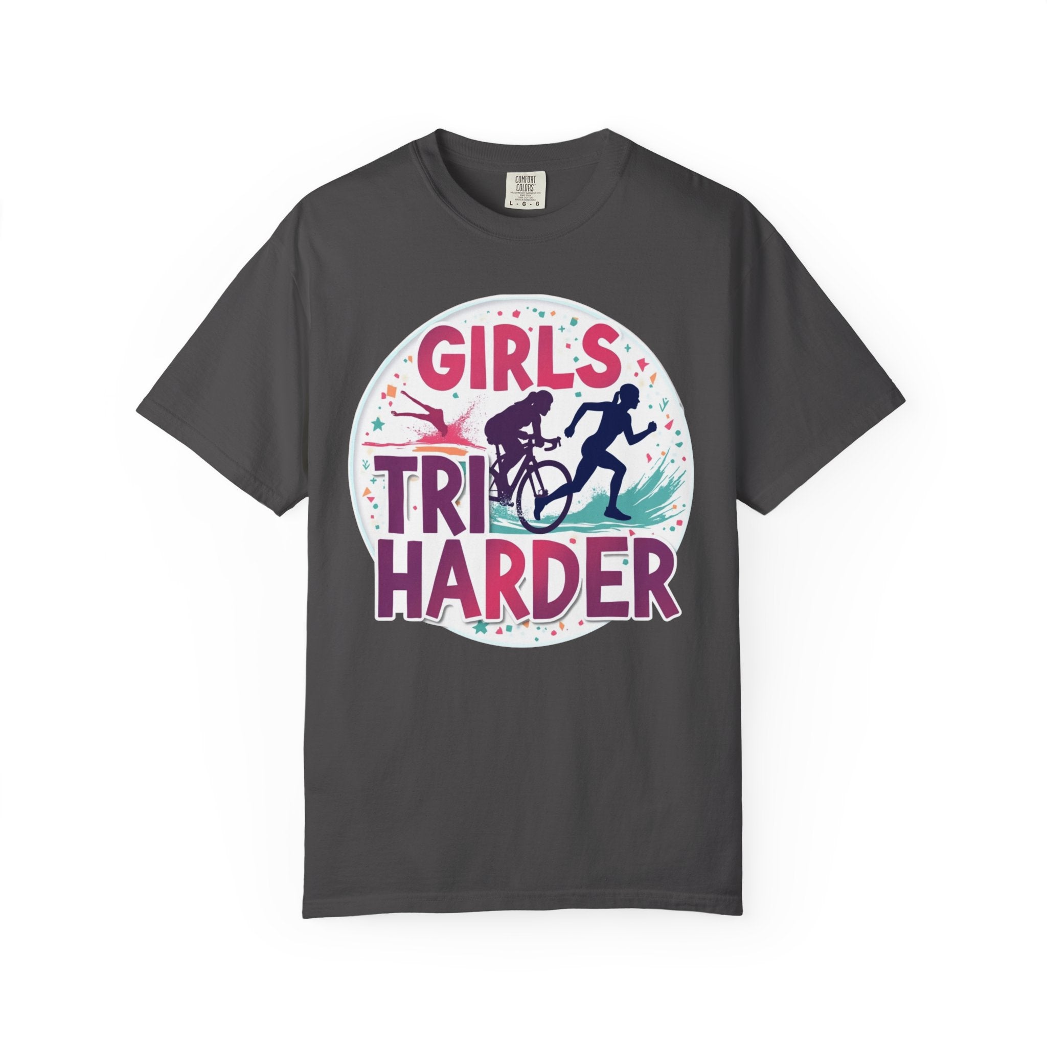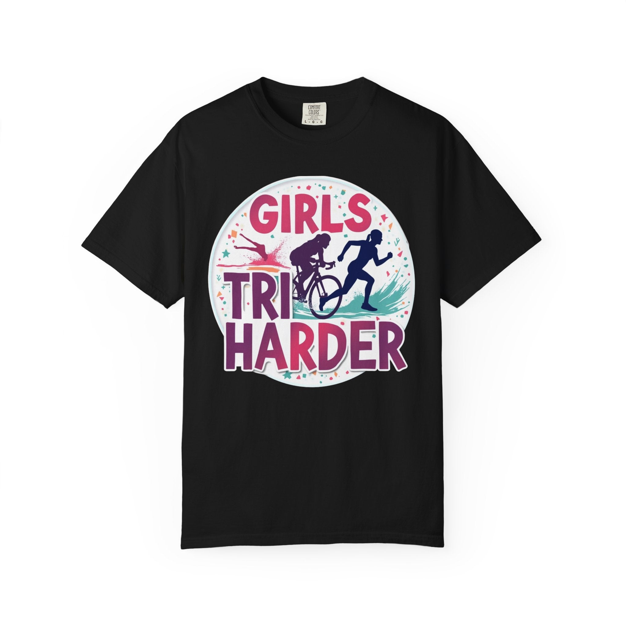 Girls Tri Harder Women's Motivational T-Shirt - 100% Ring-Spun Cotton, Garment-Dyed Sports Tee for Active Lifestyle, Gym Wear & Gifts for Triathletes