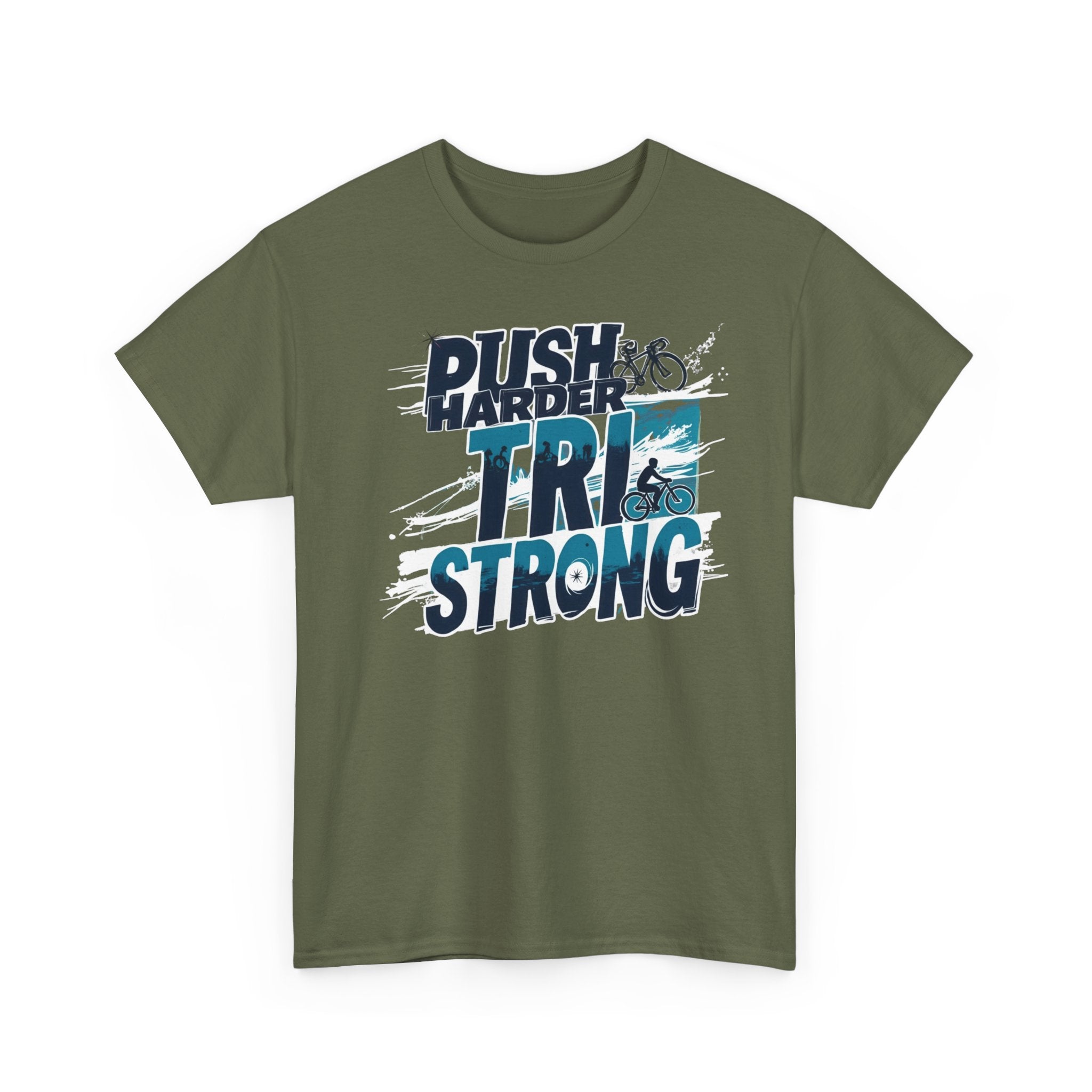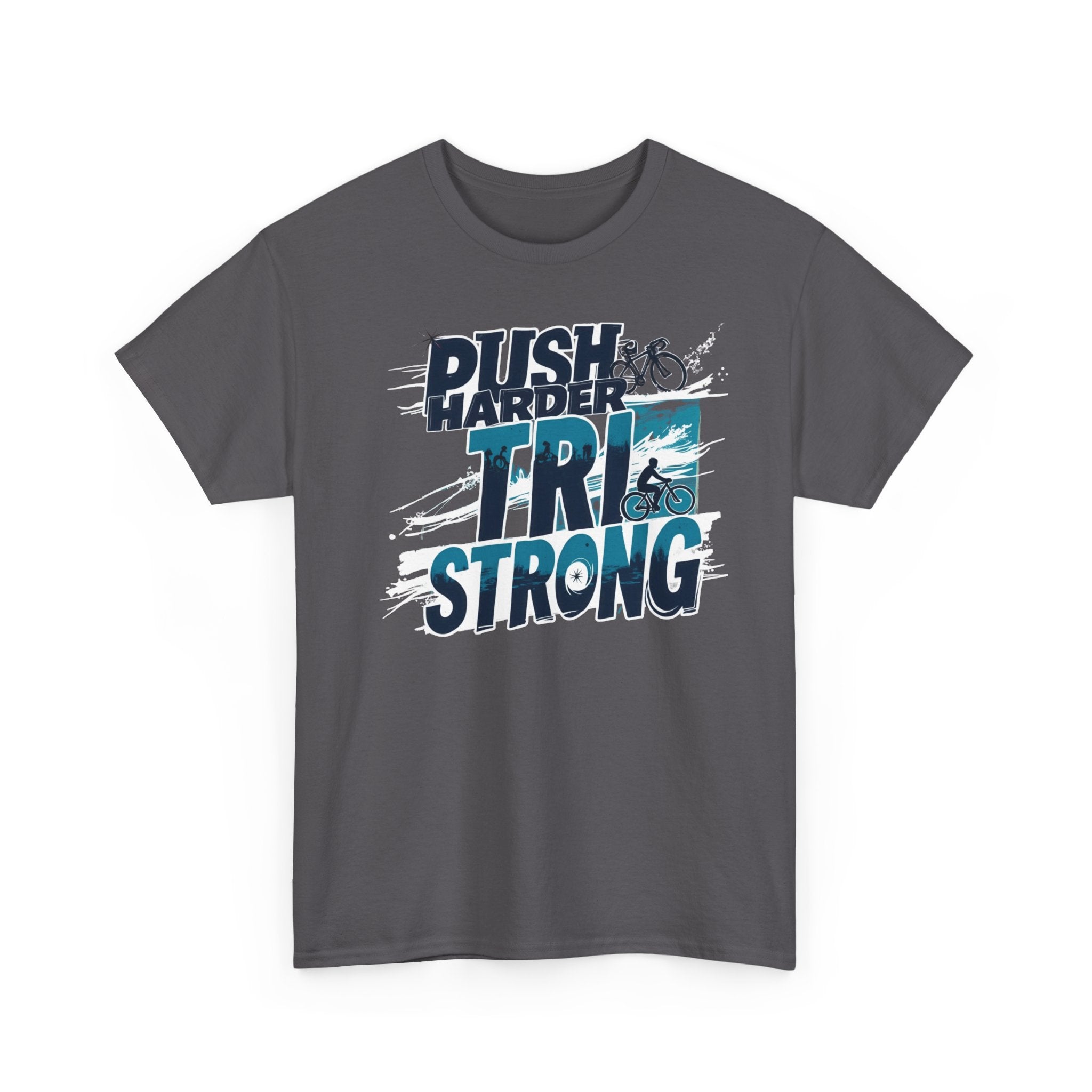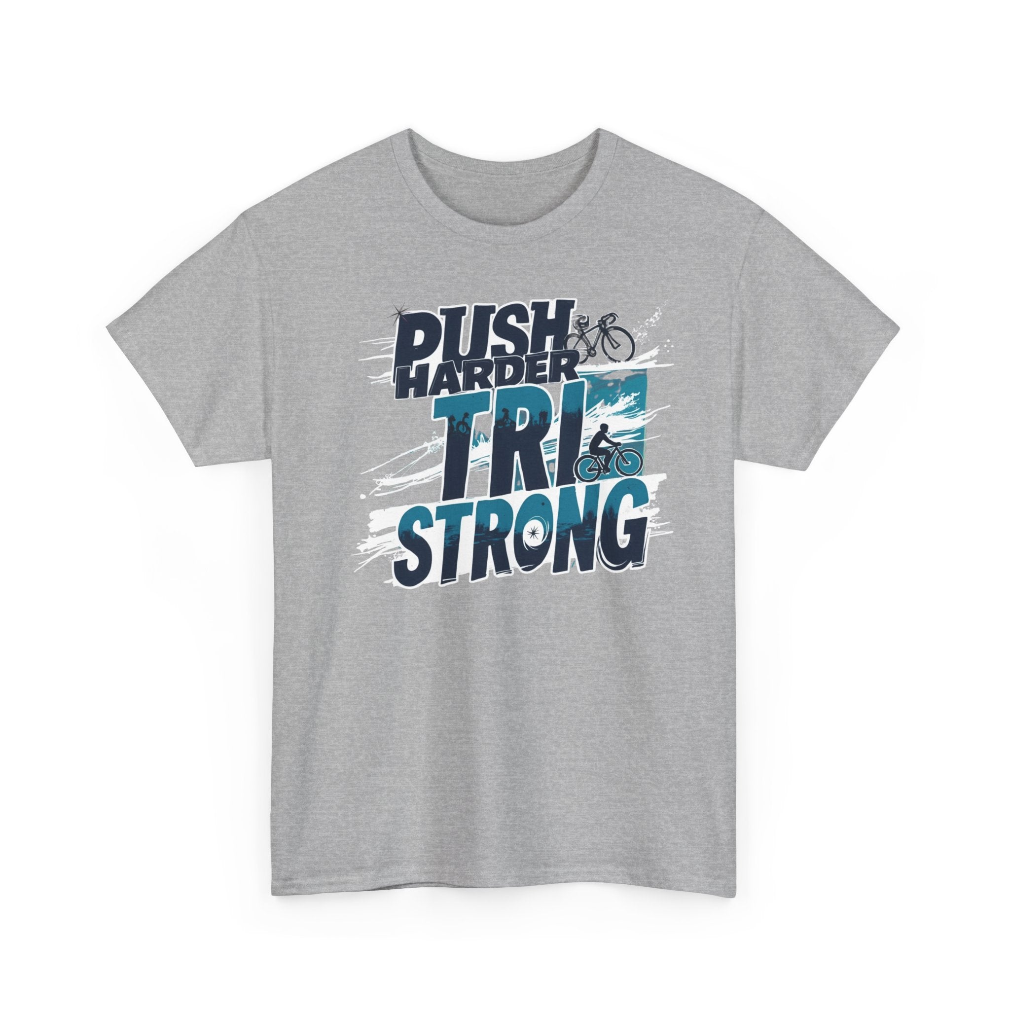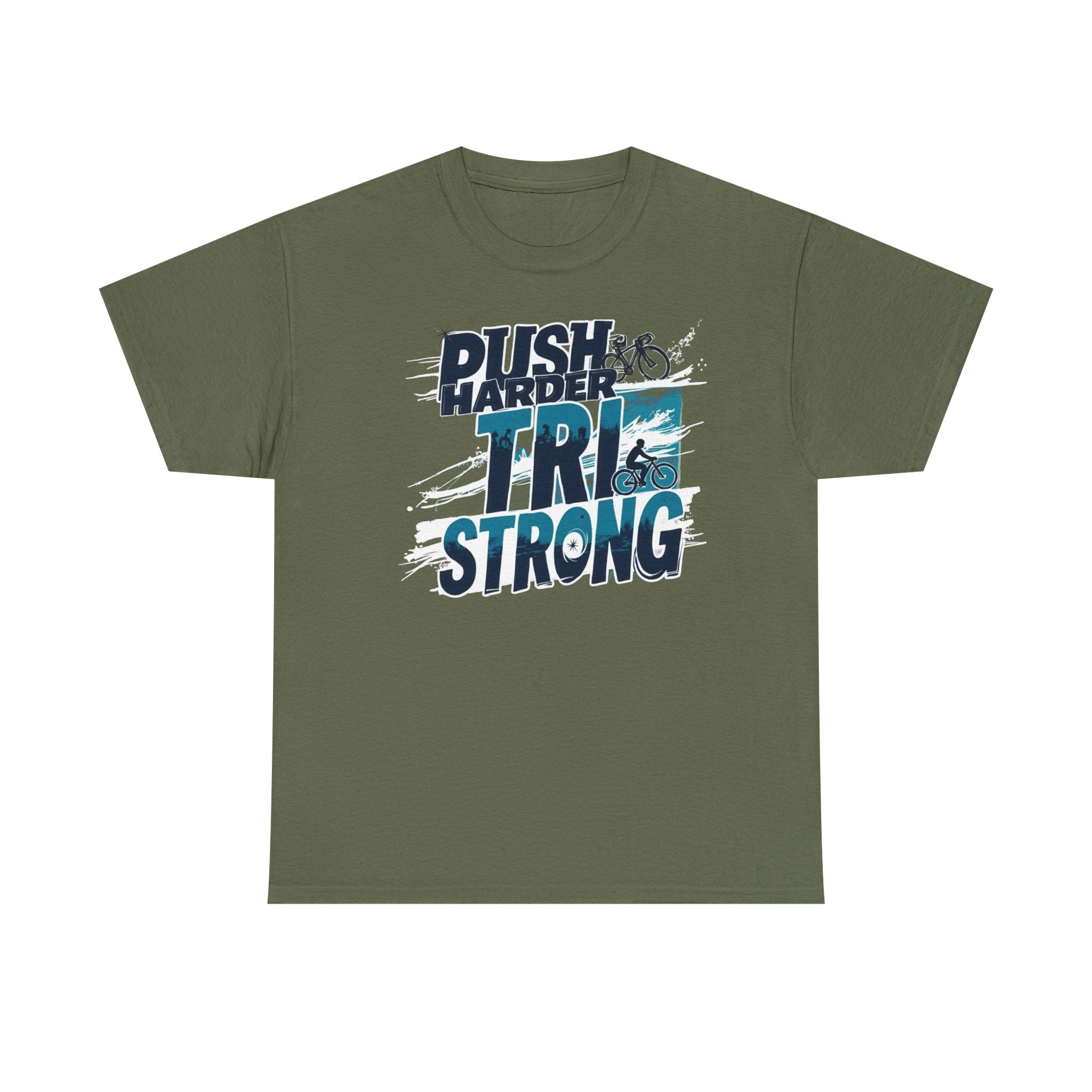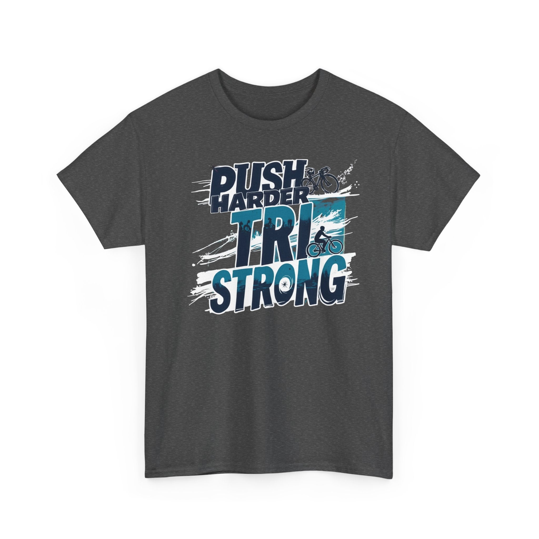 Unisex Motivational Fitness T-Shirt - Heavy Cotton Workout Tee for Gym Enthusiasts - Ethically Sourced, Durable Graphic Apparel, Push Harder Tri Strong, Gift for Athletes