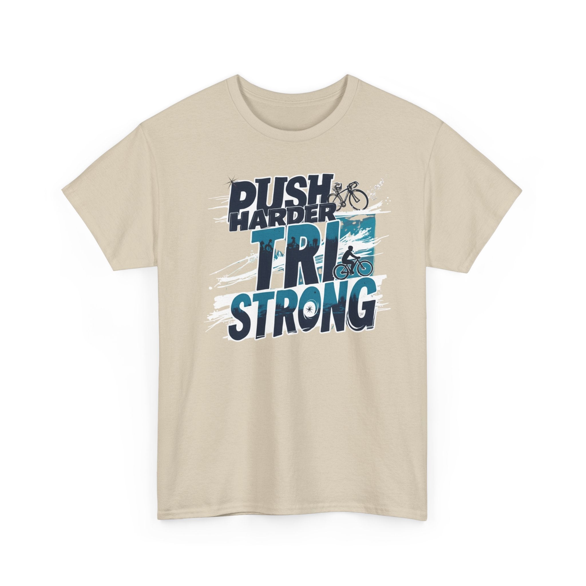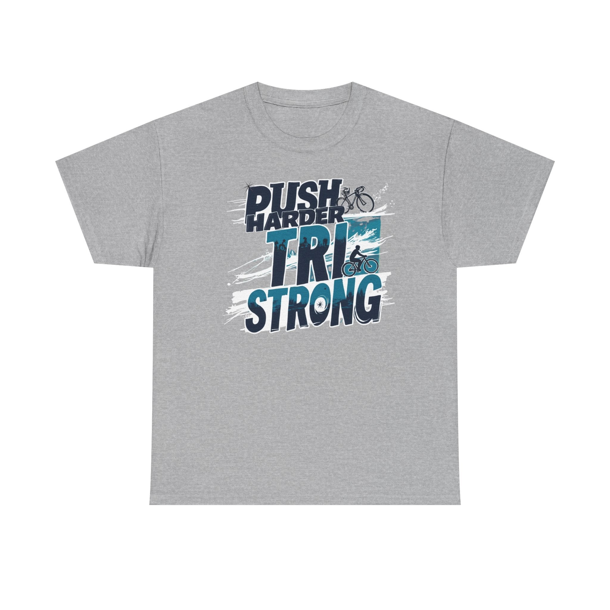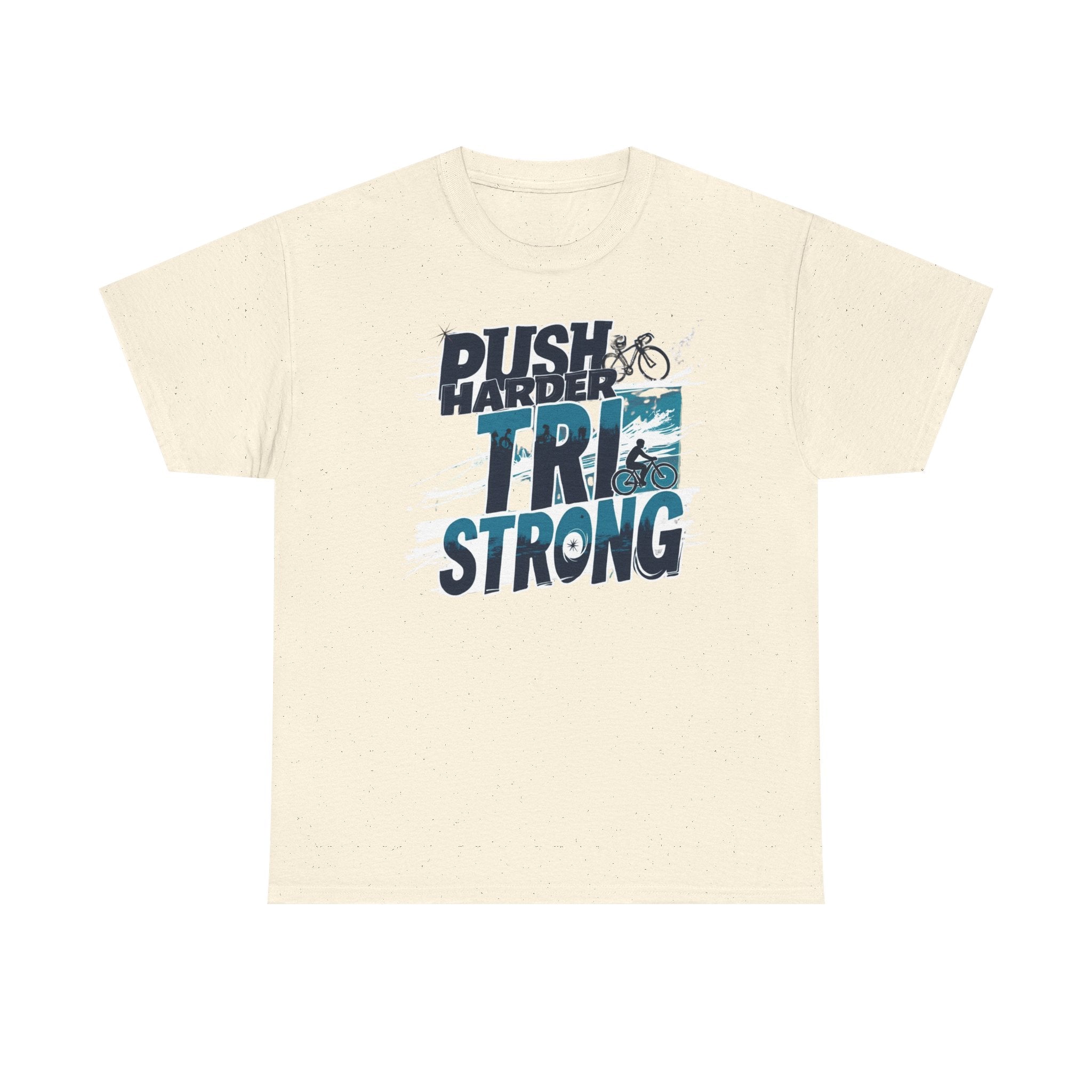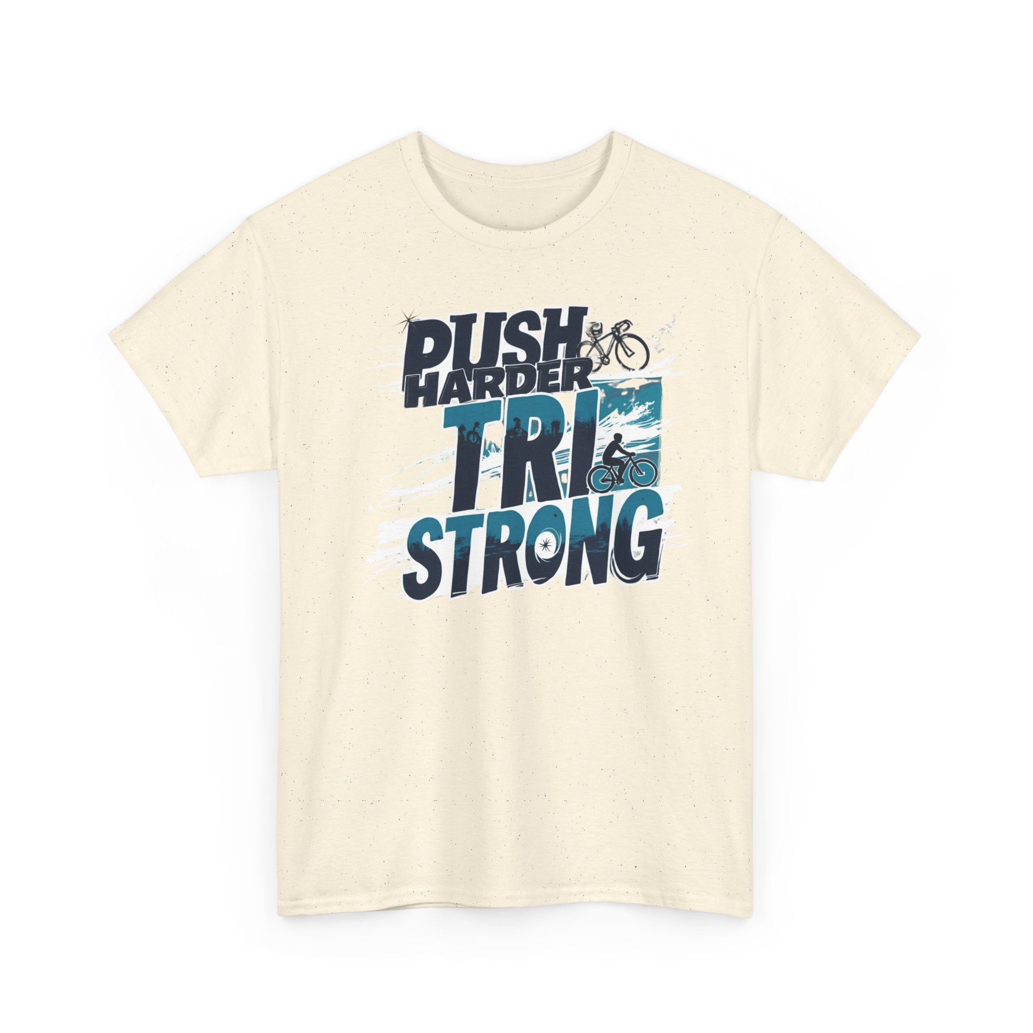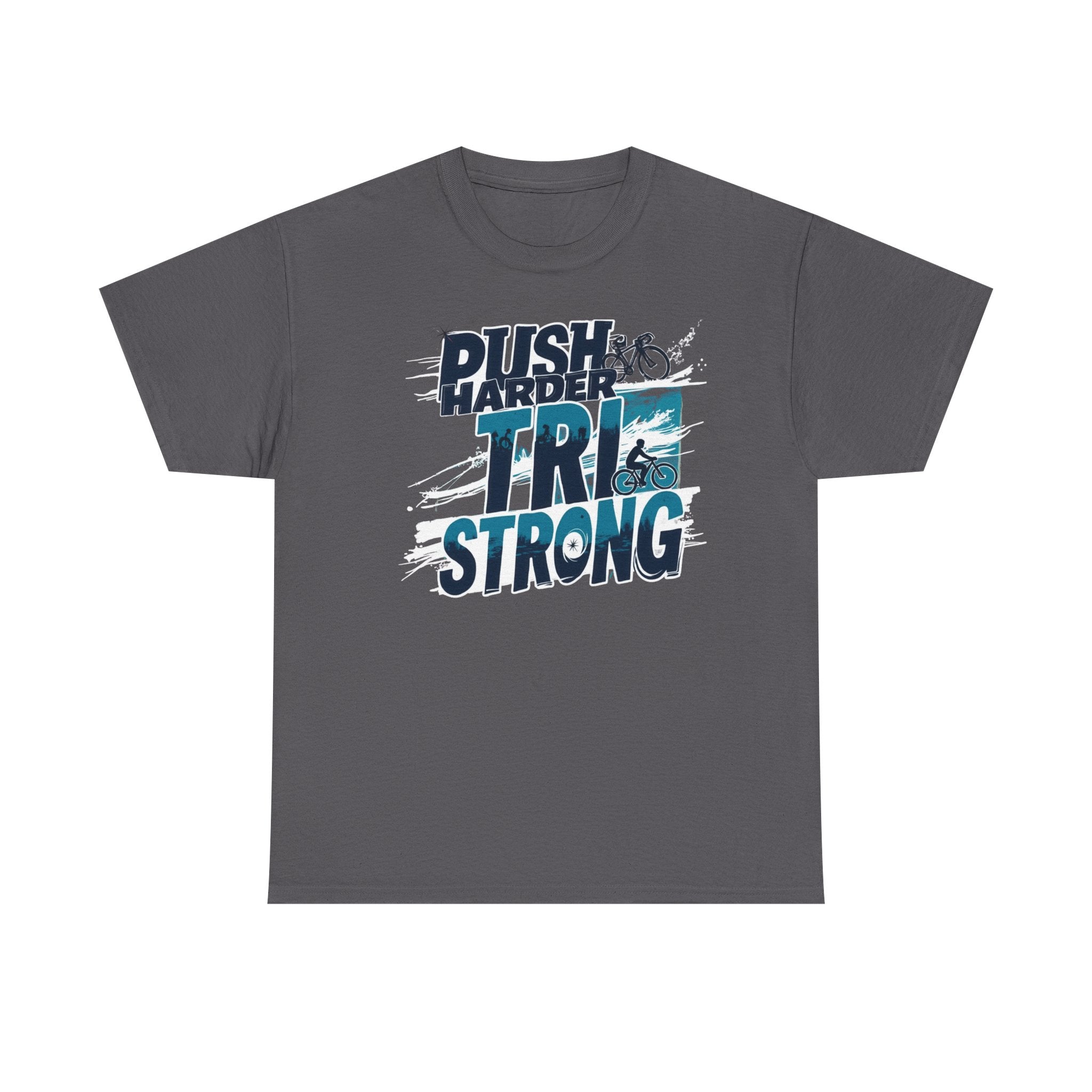 Unisex Motivational Fitness T-Shirt - Heavy Cotton Workout Tee for Gym Enthusiasts - Ethically Sourced, Durable Graphic Apparel, Push Harder Tri Strong, Gift for Athletes