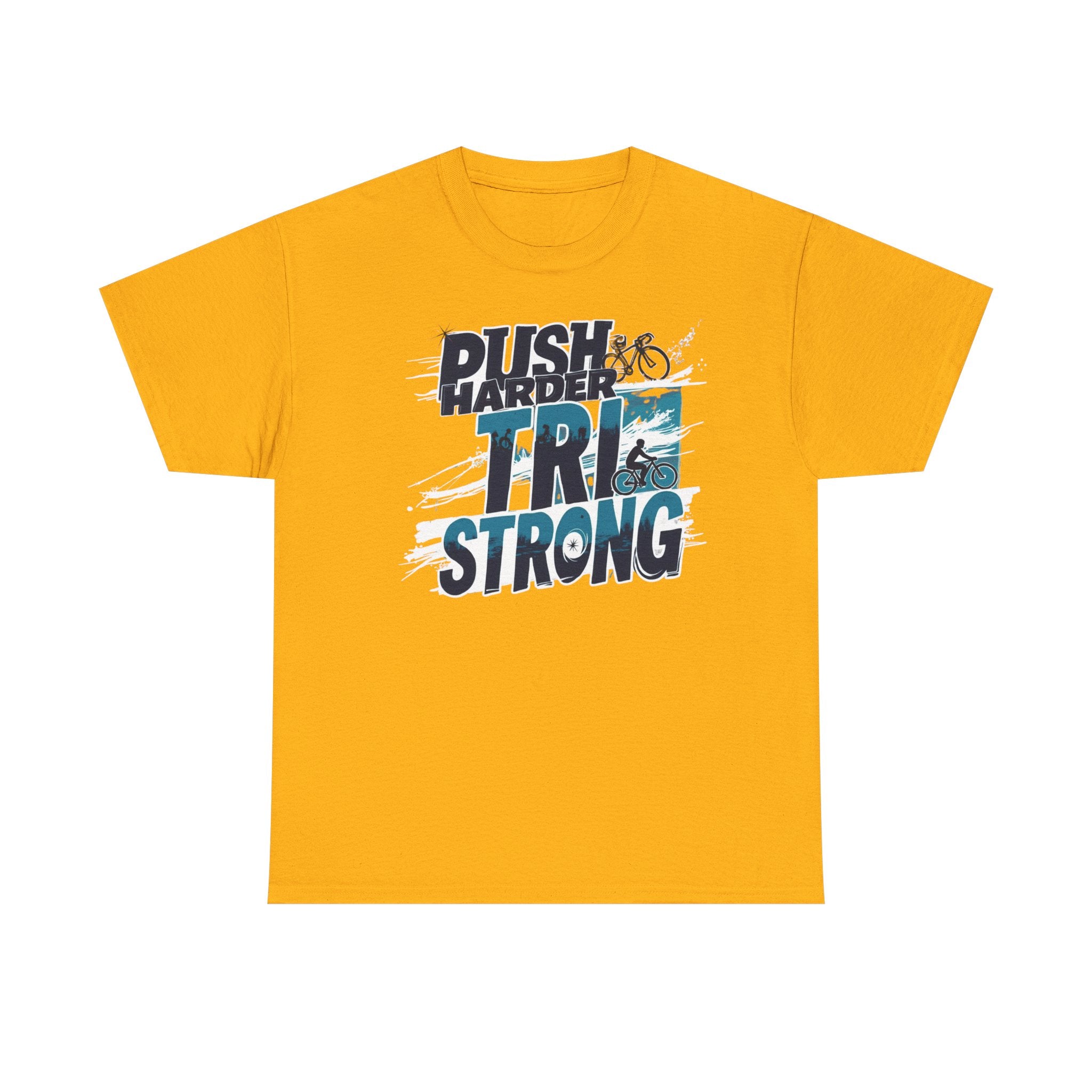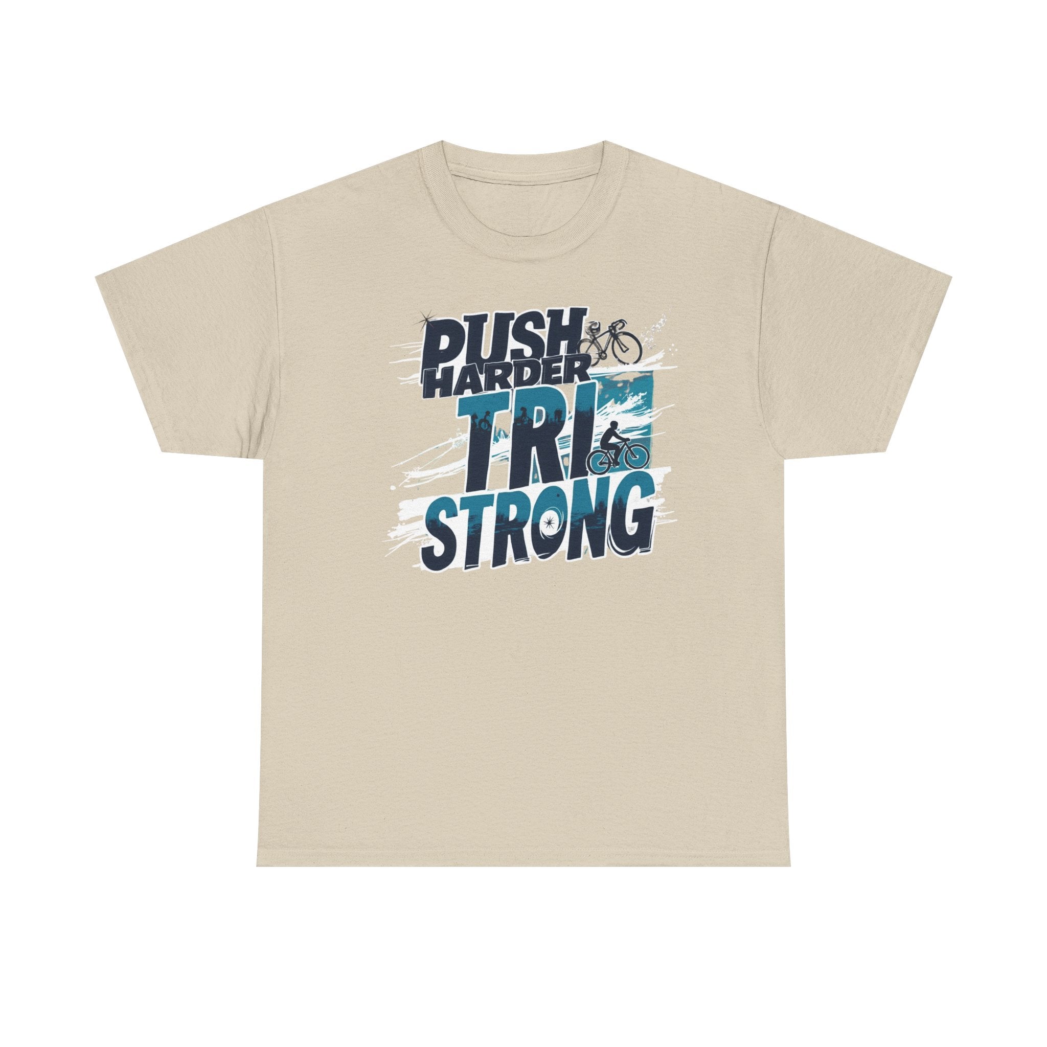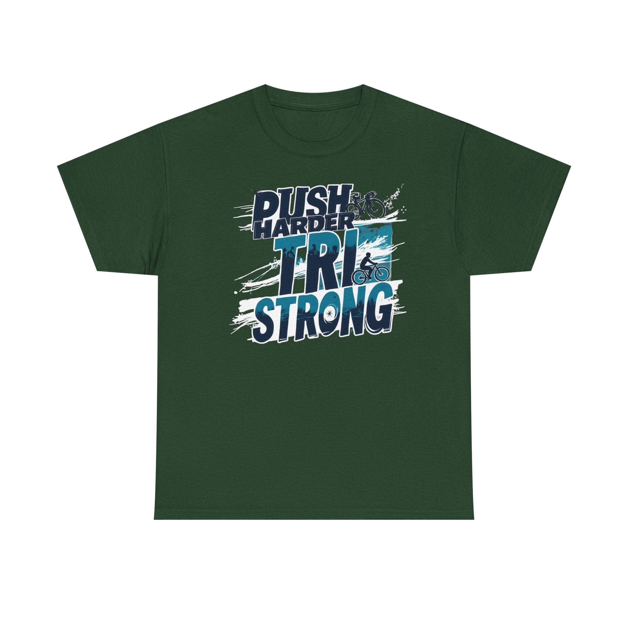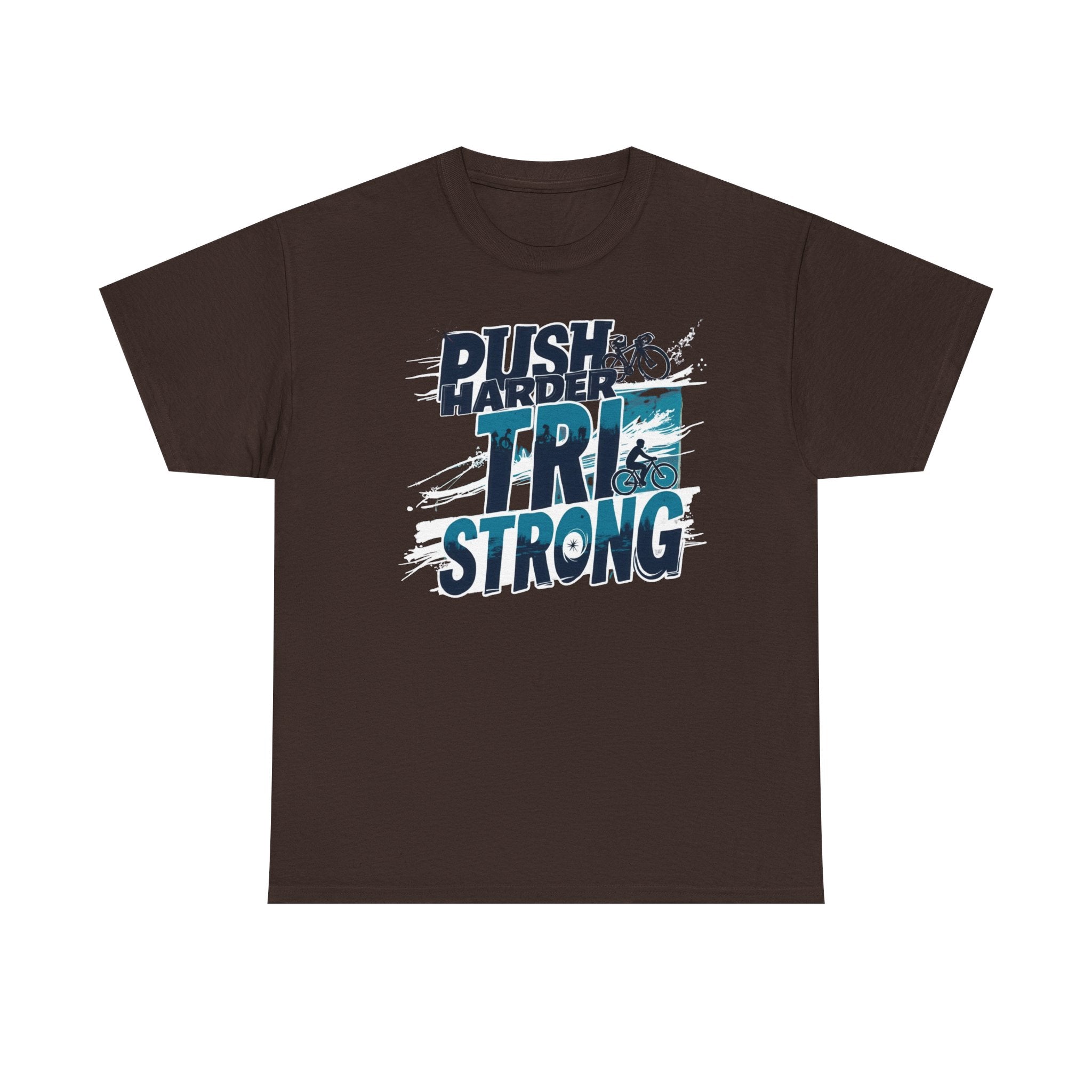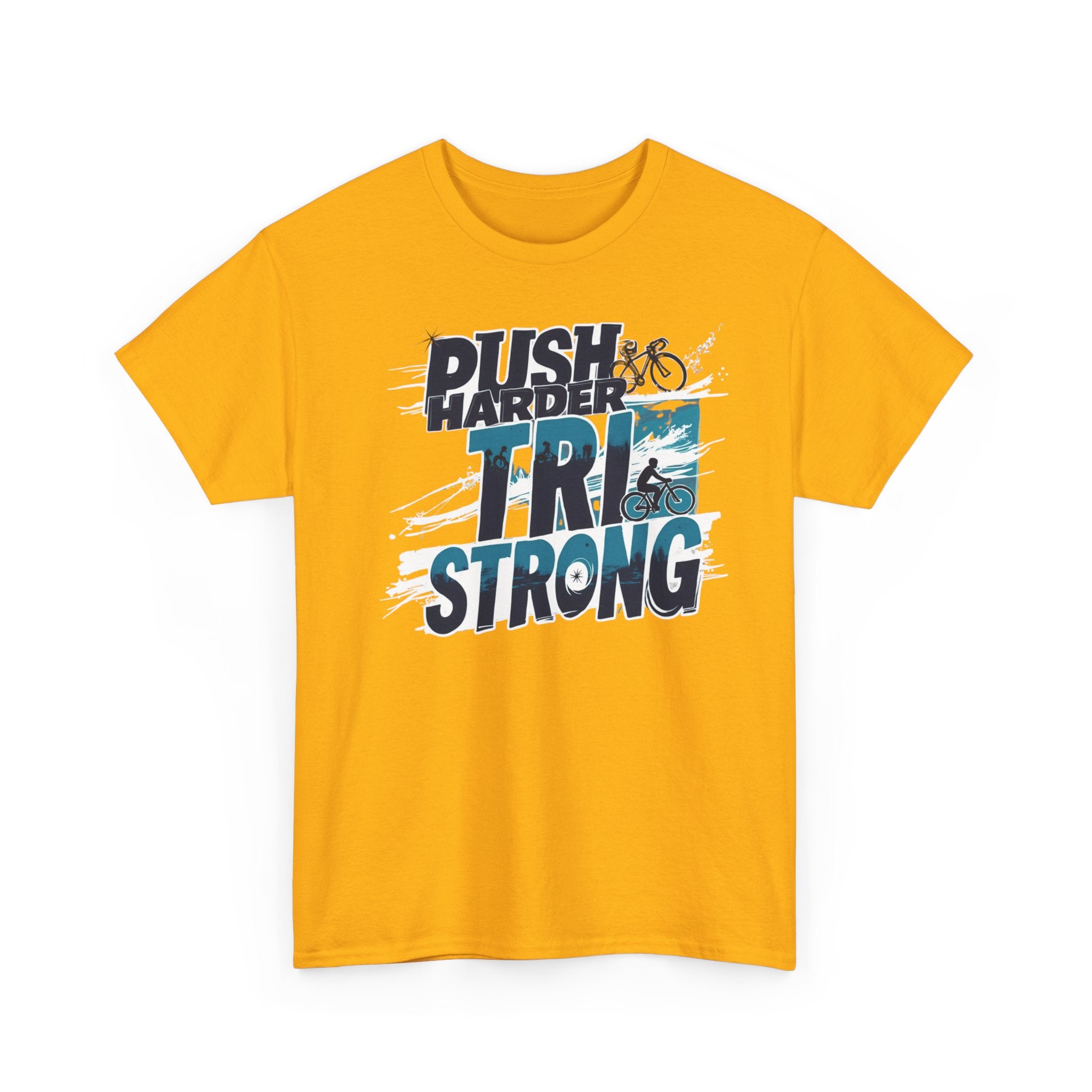 Unisex Motivational Fitness T-Shirt - Heavy Cotton Workout Tee for Gym Enthusiasts - Ethically Sourced, Durable Graphic Apparel, Push Harder Tri Strong, Gift for Athletes
