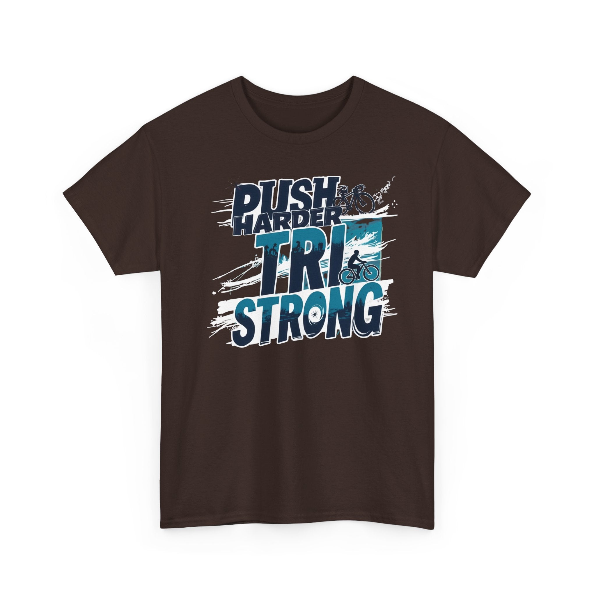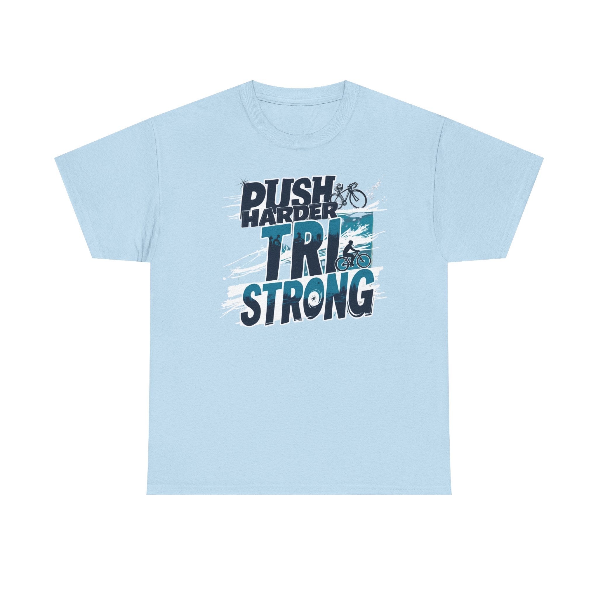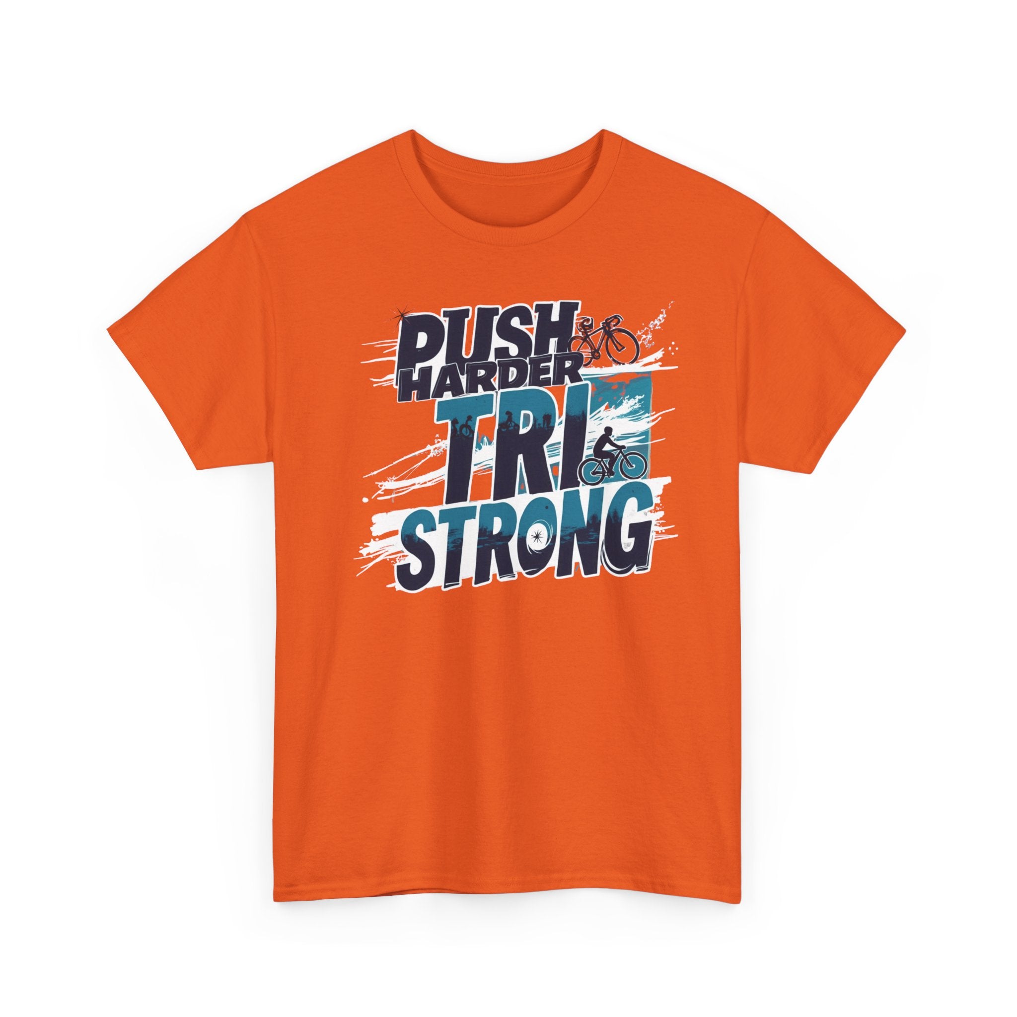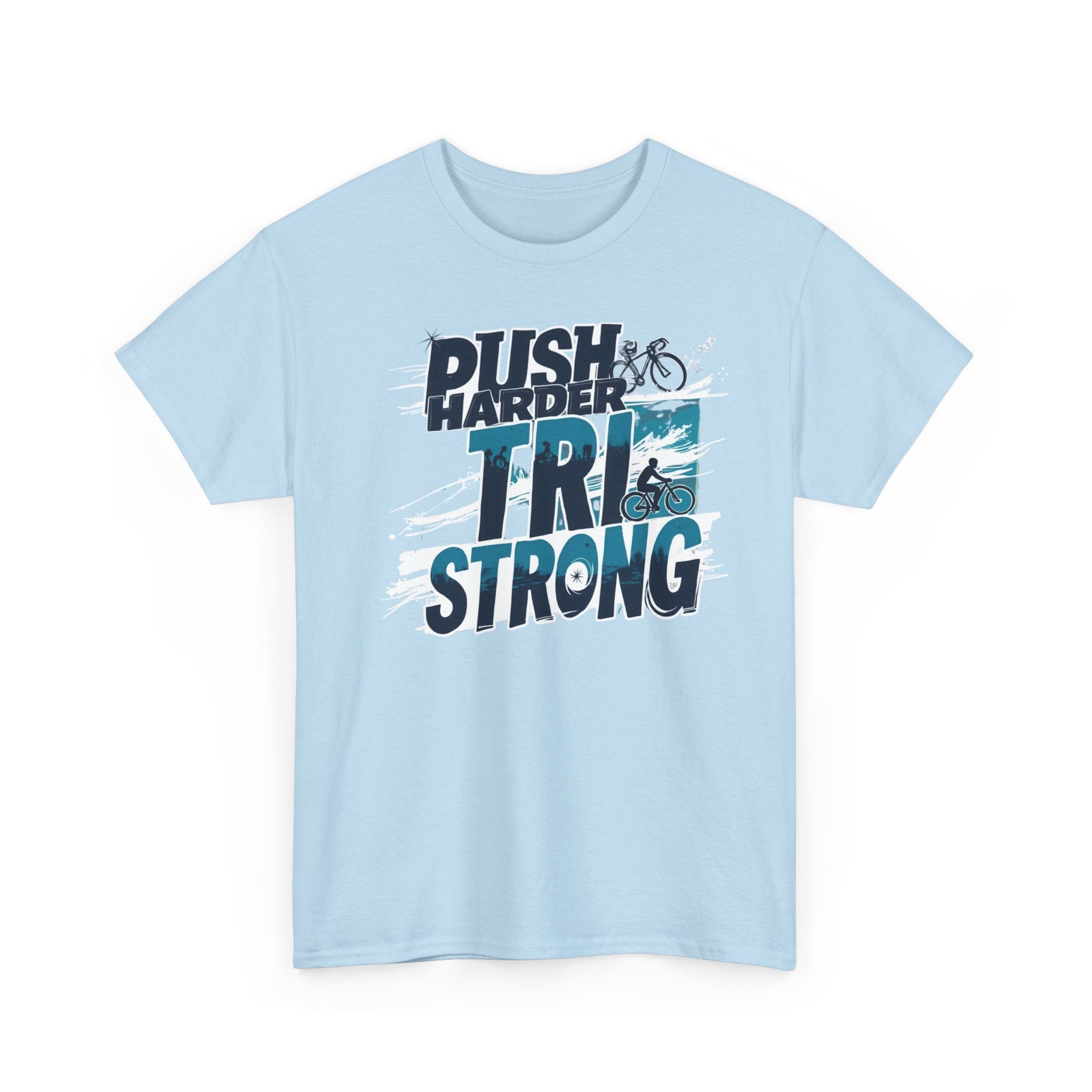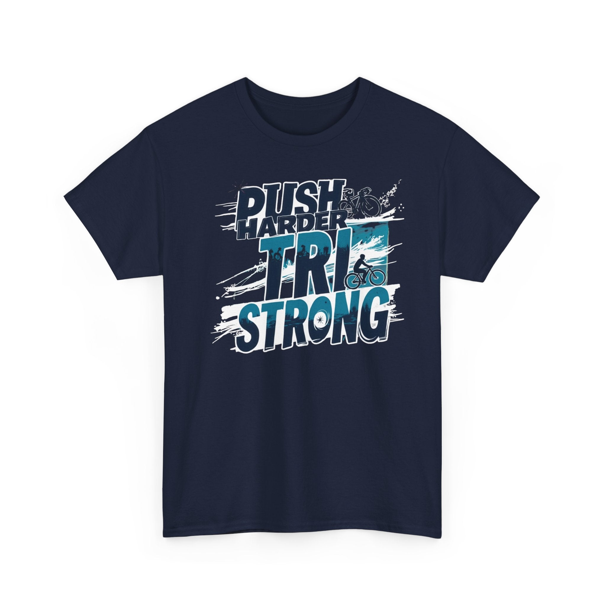 Unisex Motivational Fitness T-Shirt - Heavy Cotton Workout Tee for Gym Enthusiasts - Ethically Sourced, Durable Graphic Apparel, Push Harder Tri Strong, Gift for Athletes