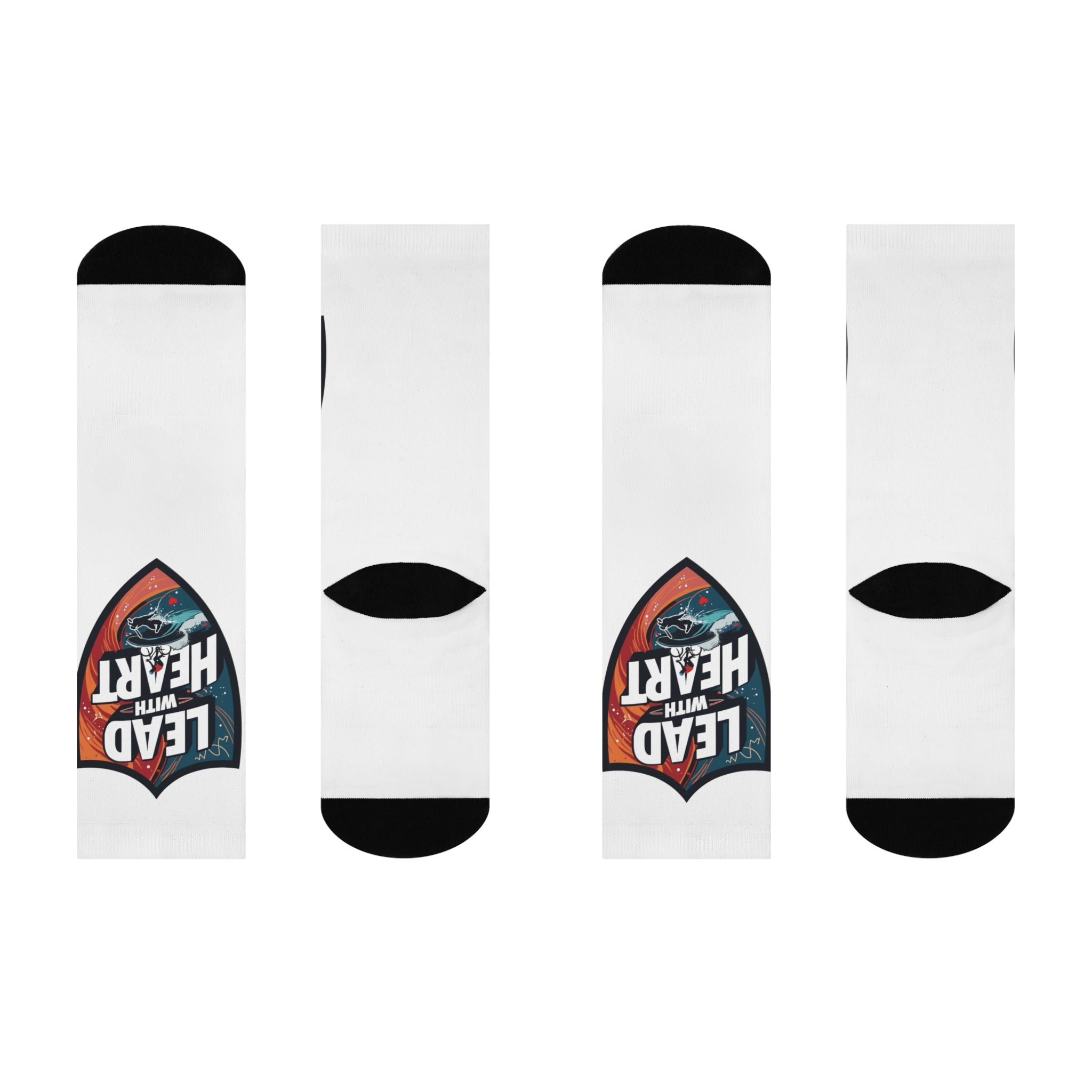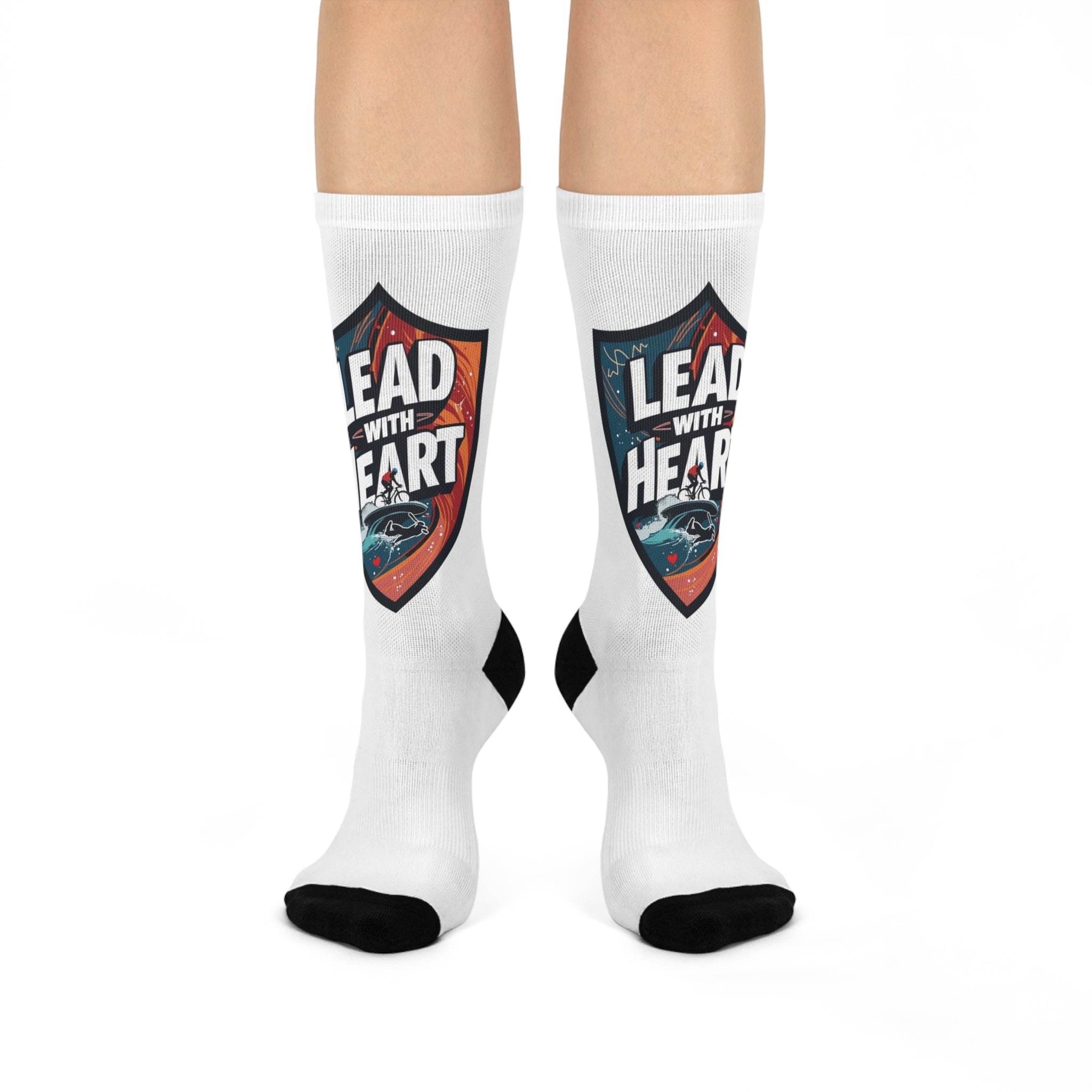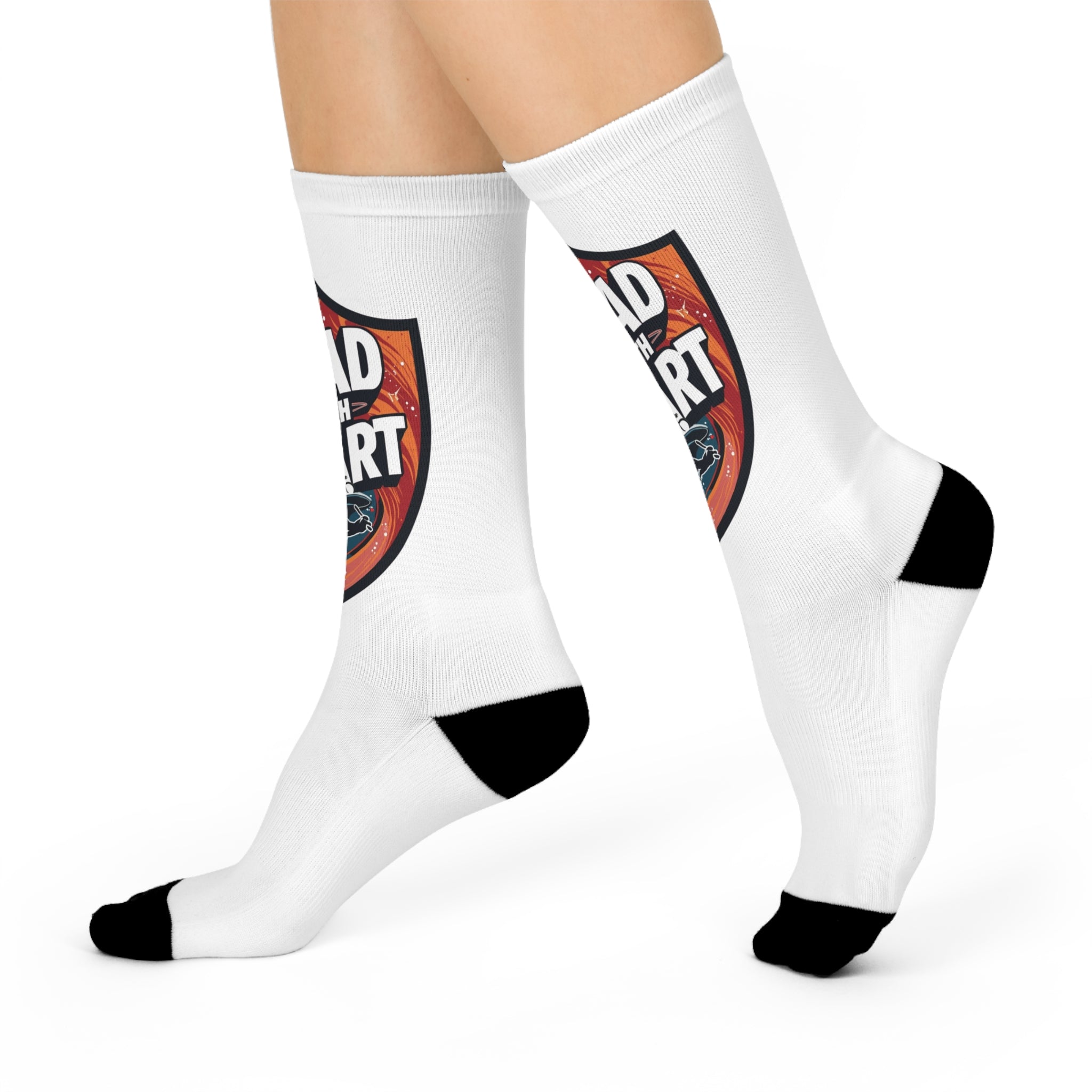 These cushioned crew socks bring bold attitude to everyday wear. The full-print design wraps the shaft with a vintage-style shield graphic that reads “Lead with Heart,” set against warm, textured tones and a small illustrative element near the ankle. Soft, stretchy knit hugs the foot while the padded sole eases long days on your feet. They slip easily into casual or smart-casual outfits, and the bright, high-resolution print keeps the message clear even after many washes. Wear them when you need a quiet reminder to choose courage and compassion — whether you’re running errands, heading to a low-key meet-up, or settling in for a long shift.