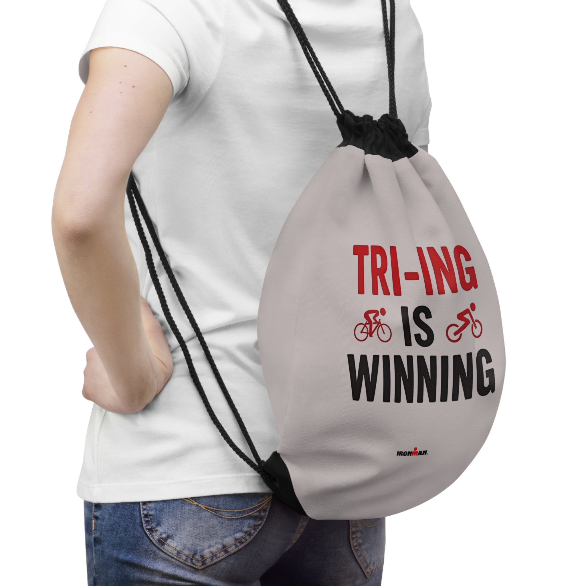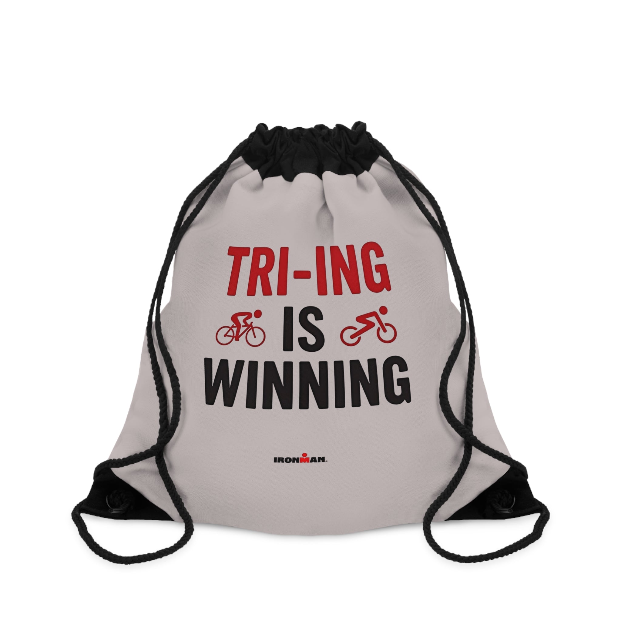 Triathlon Drawstring Bag - Tri-ing Is Winning Print Gym Sack | 100% Polyester Quick-Dry With Zippered Pocket