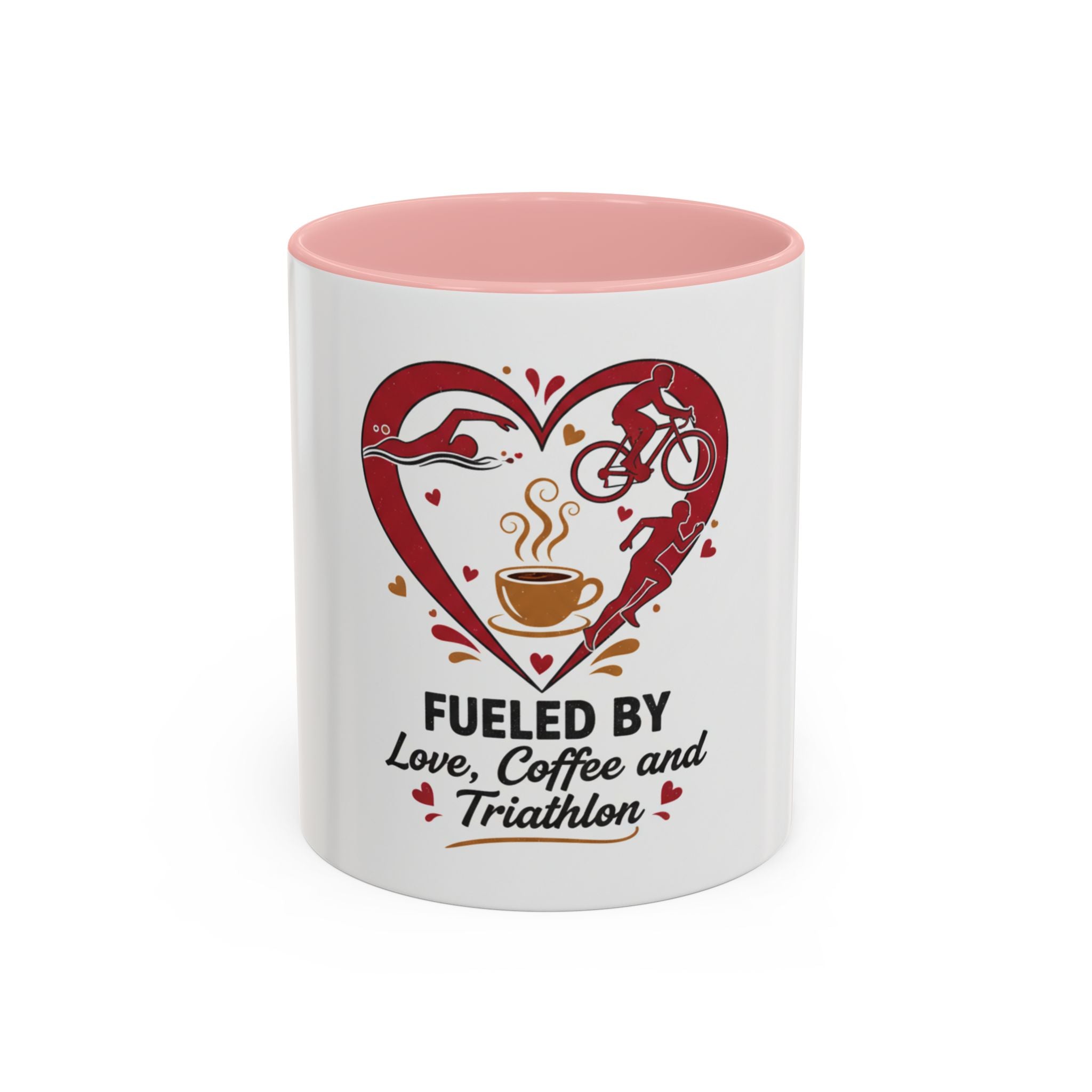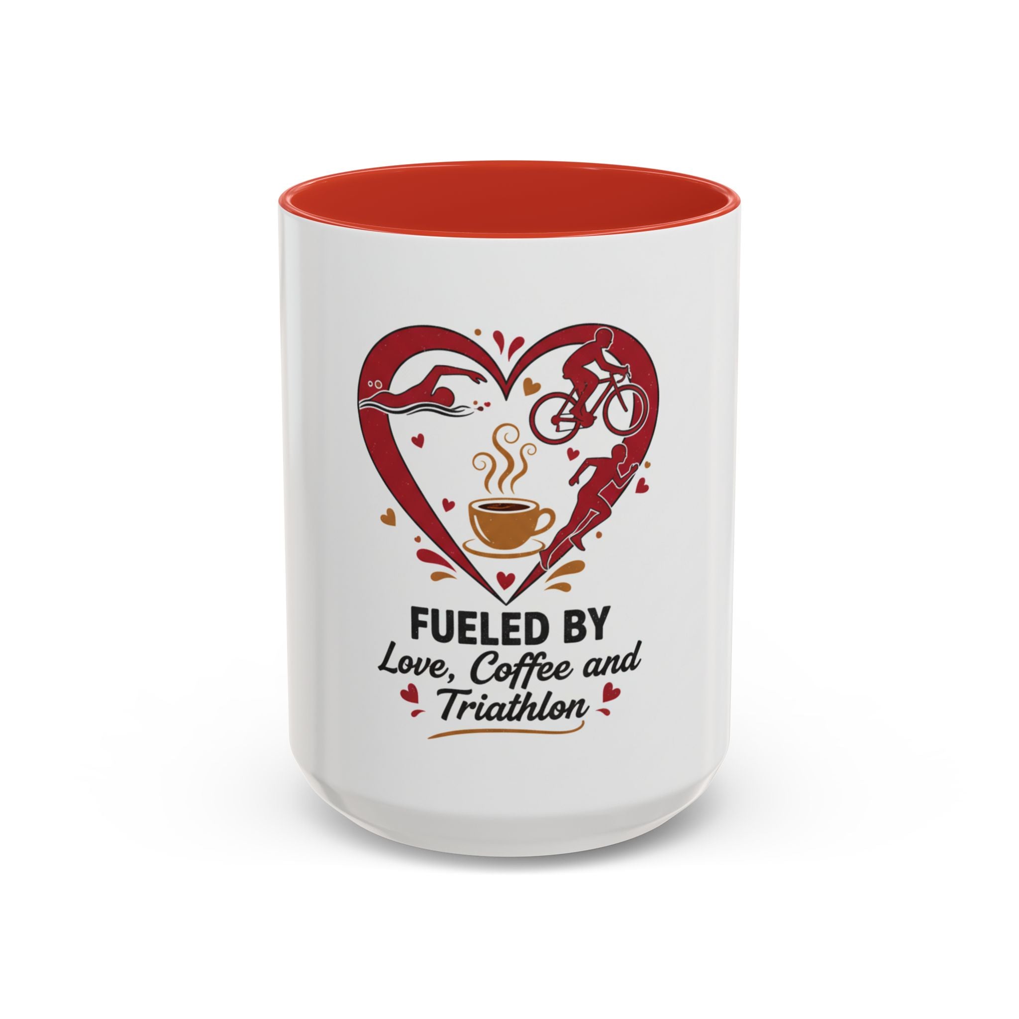 The mug features eye-catching triathlon-themed accents and phrases like "Swim, Bike, Run, Repeat" to inspire you during early mornings or long training sessions. It's designed to be a fun way to kickstart your day with caffeine and motivation.