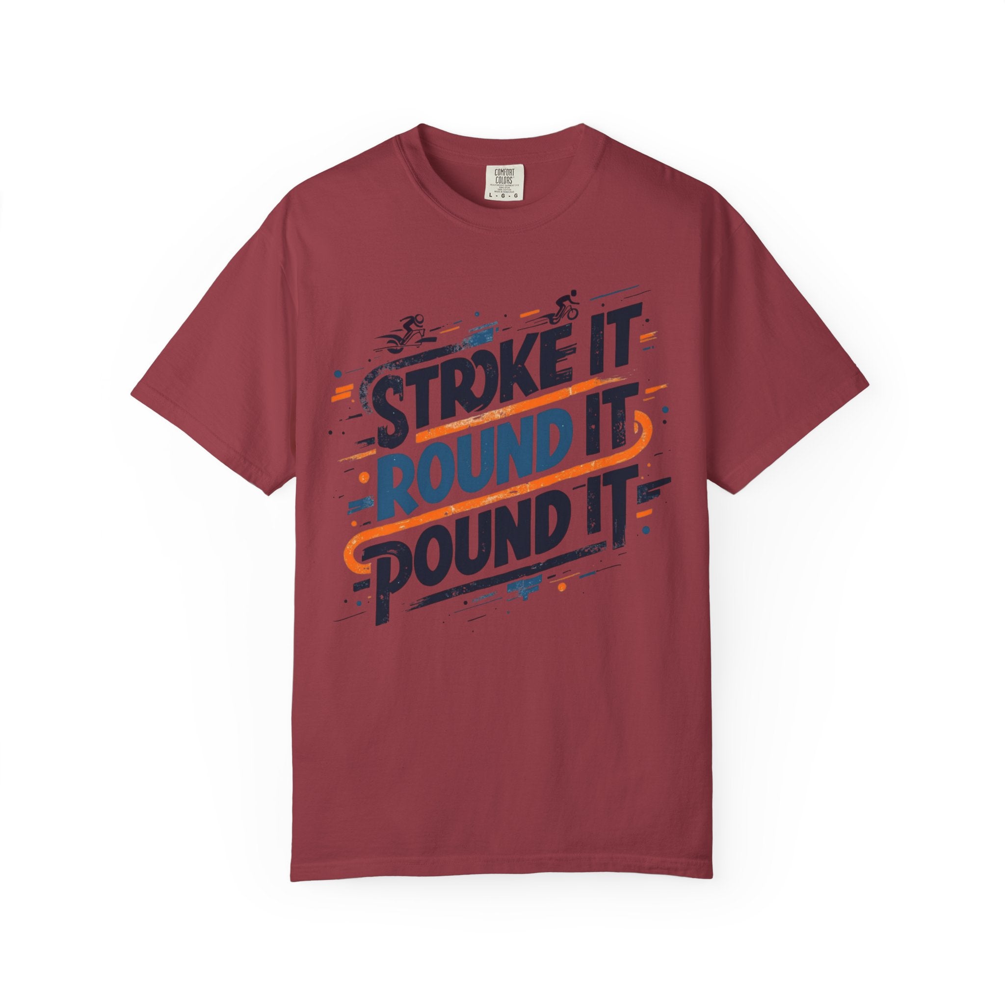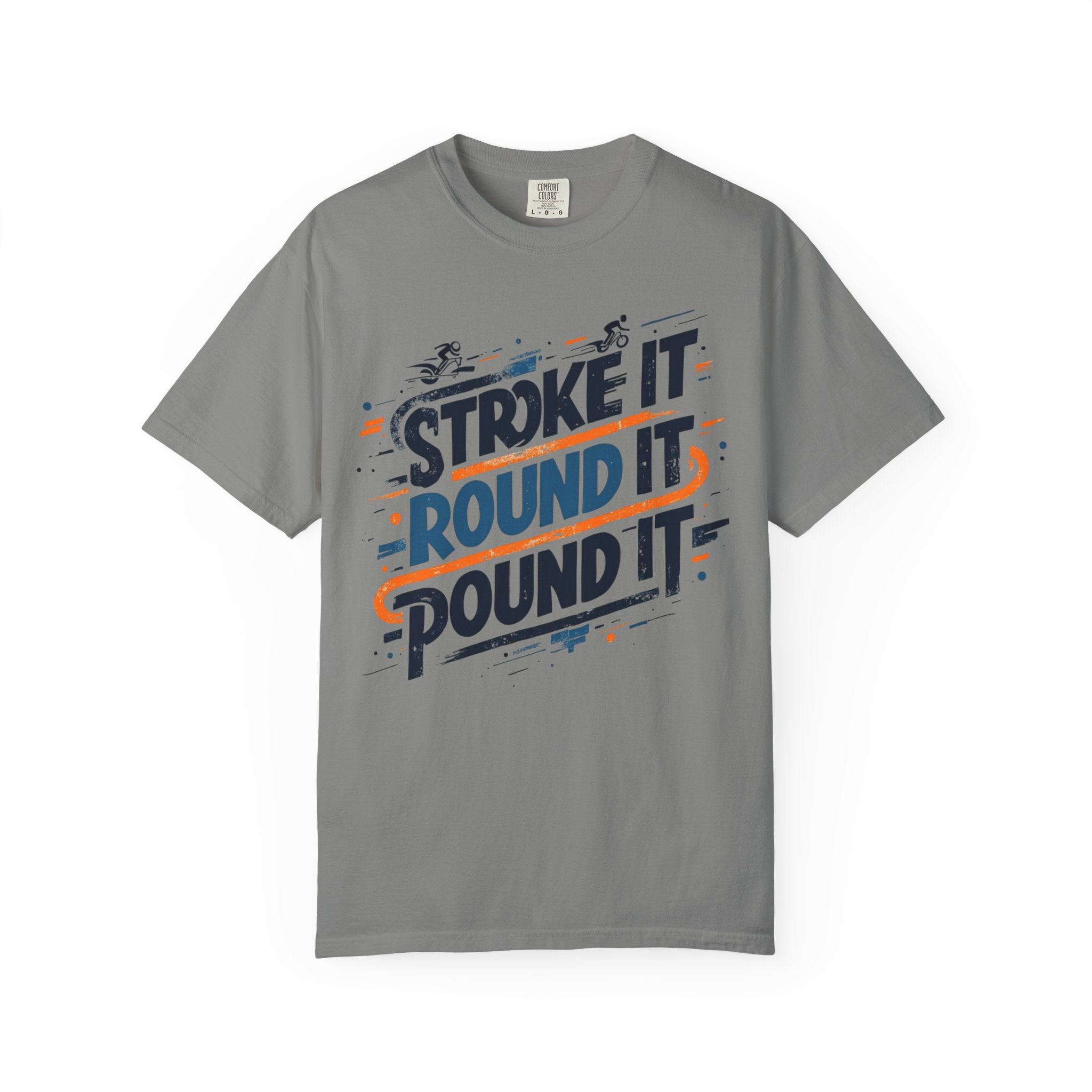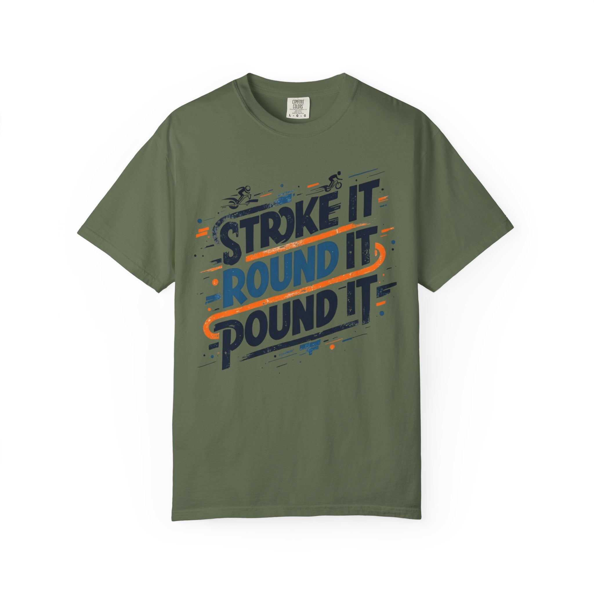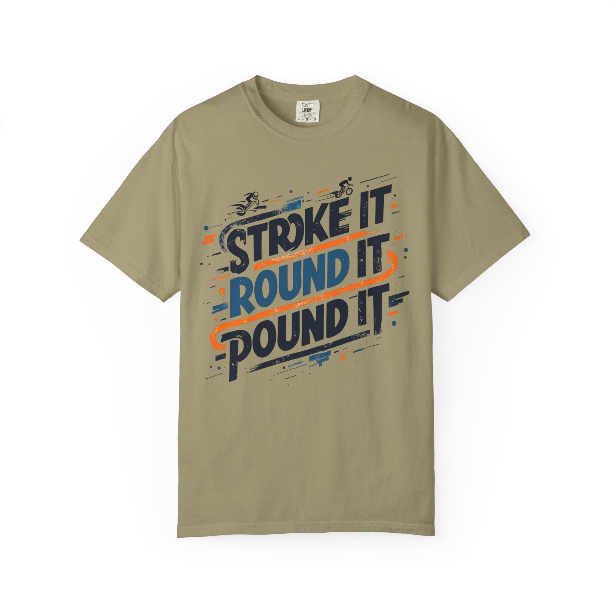 Stückgefärbtes T-Shirt mit „Strike It, Round It, Pound It“-Design – perfekt für Sportfans, Freizeitkleidung, Geschenke, Geburtstagsfeiern, [...]