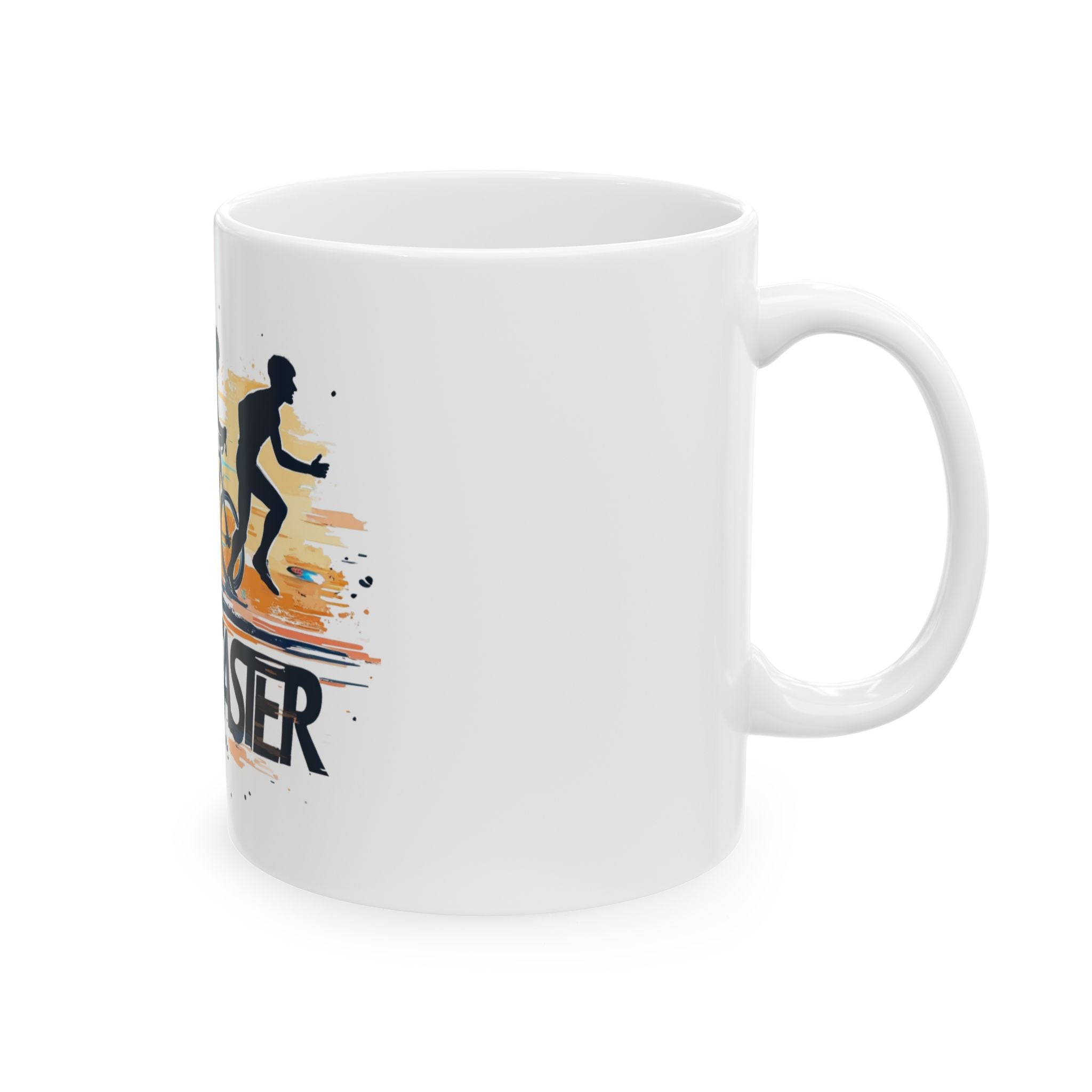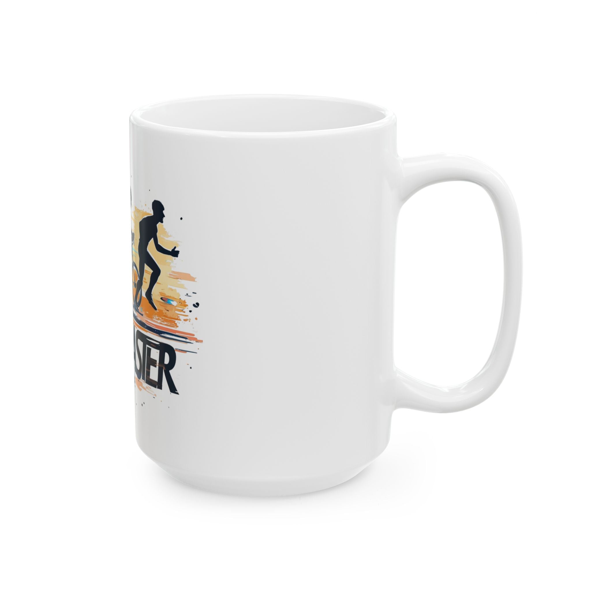 This glossy ceramic mug celebrates the joy of movement and the humor of getting older — but faster. Bold silhouettes of a runner and cyclists race across a splashy, sunrise-hued background, underscored by the playful “OLDER FASTER” lettering. It feels like an early-morning group ride or a post-run laugh with teammates: warm, energized, and a little bit cheeky. The bright print pops on durable white ceramic, making it a lively companion for coffee before training, tea after a long run, or as a desk reminder to keep chasing personal bests.