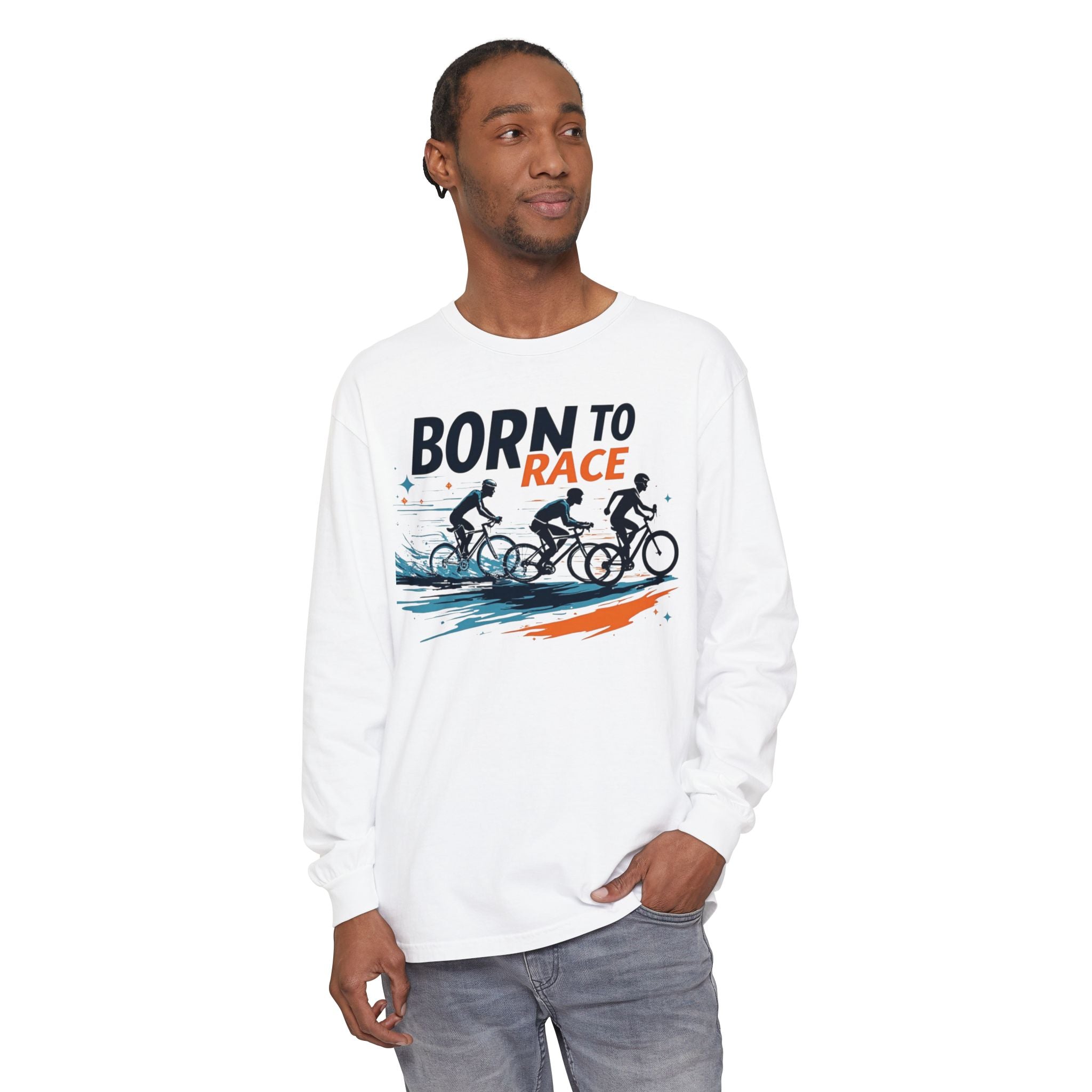This long-sleeve shirt carries the pulse of the road. Lightweight but sturdy ring-spun cotton feels soft against skin while the garment-dyed finish gives the color a lived-in, vintage look. The front art—three cyclists cutting through brushstrokes of motion with the bold line "BORN TO RACE"—brings energy to training rides, warm-up laps, or weekend group outings. Cuffs are ribbed for a confident fit, and reinforced neck and shoulder tape keep the tee sitting right after countless washes. Wear it on cool mornings before the sprint, layered under a vest for fall rides, or on rest days when you still want to carry that competitive spark.