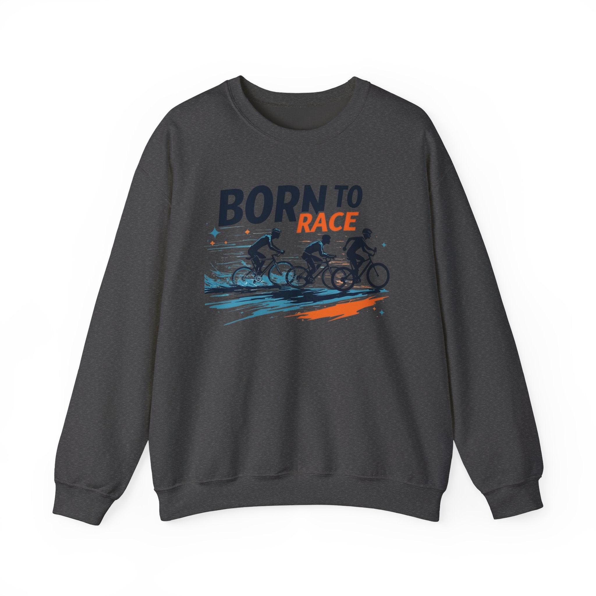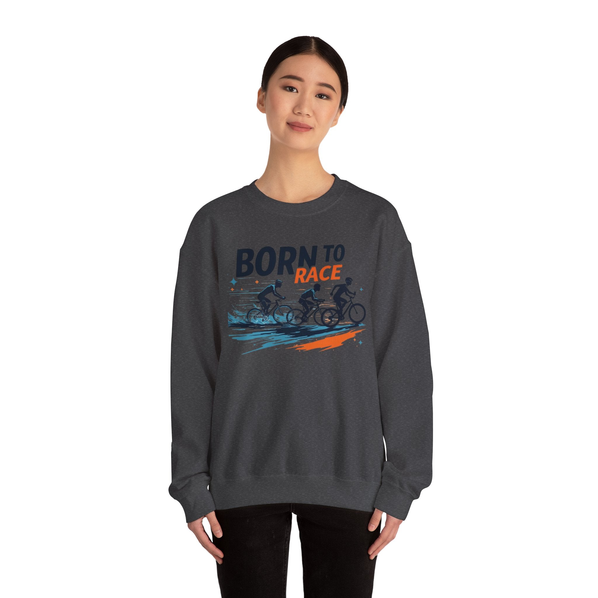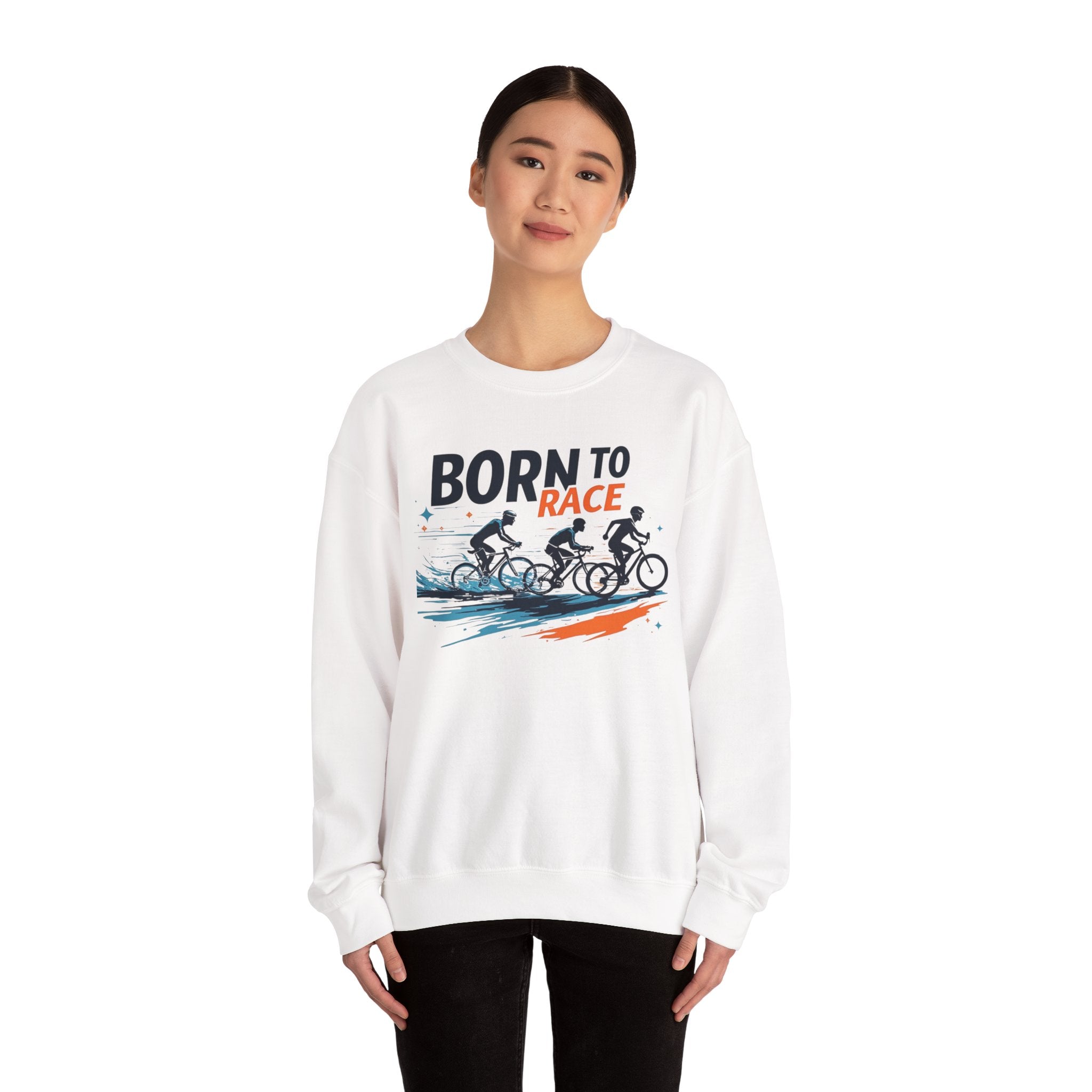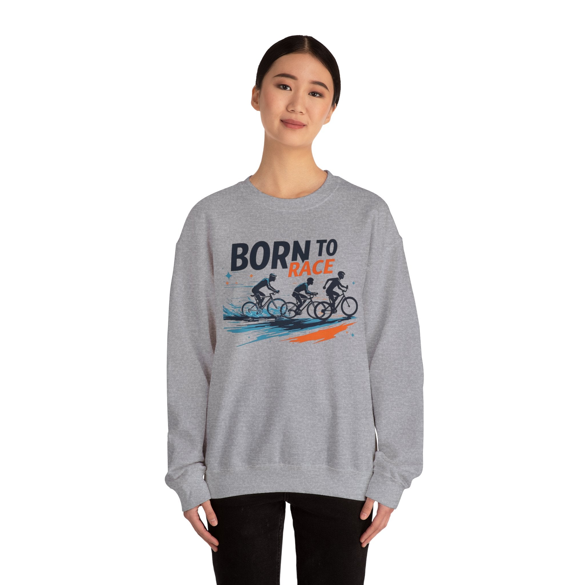 Eco-Conscious Crewneck Sweatshirt "Born to Race" Cycling Graphic - Triathlon Training Pullover 50/50 Cotton-Poly Blend Durable Breathable Apparel