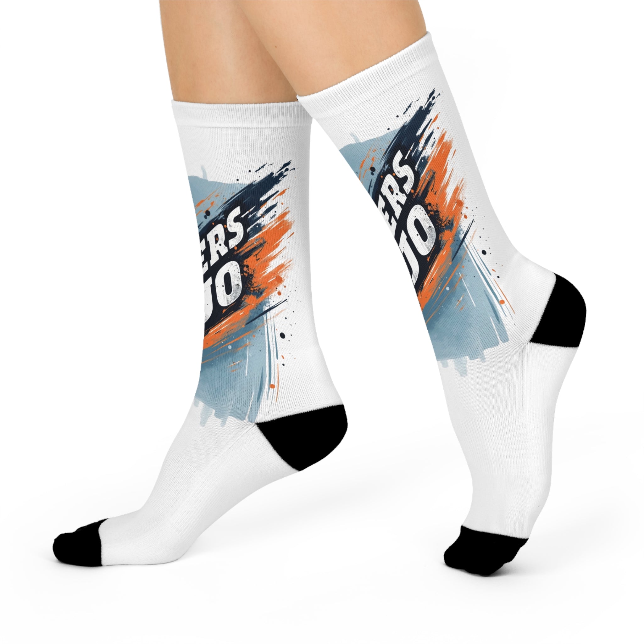 These cushioned crew socks bring energy to every ride and every day. The design’s bold brushstrokes of slate blue and sunset orange frame a dynamic cycling silhouette and sporty lettering, giving the socks a lived-in, race-day vibe. Thick cushioned soles cradle your feet on long group rides or during a day on your feet, while the smooth, stretchy knit keeps the print vivid and steady. They pull on easily, sit securely at mid-calf, and add a confident pop under shorts, jeans, or kit. Wear them to training, post-ride coffee runs, or when you want a subtle nod to your cycling obsession — comfortable, colorful, and built to move with you.